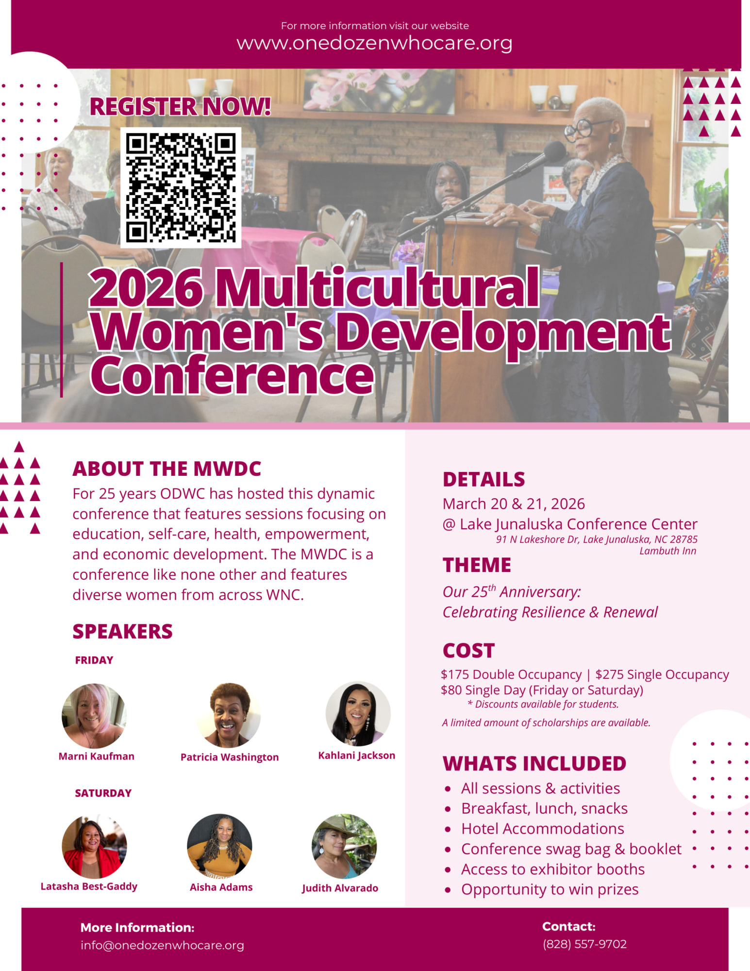 The 2026 Multicultural Women’s Development Conference will be held at the Lambuth Inn at beautiful Lake Junaluska Conference and Retreat Center (91 N. Lakeshore Dr., Lake Junaluska, NC) on March 20 & 21, 2026. MWDC 25 represents the 25th year of hosting this dynamic conference. We invite women from all over the region … and the world … to come and enjoy the 2026 event that will feature keynote speakers and breakout sessions on education, self-care, health, empowerment, and economic development and sustainability.