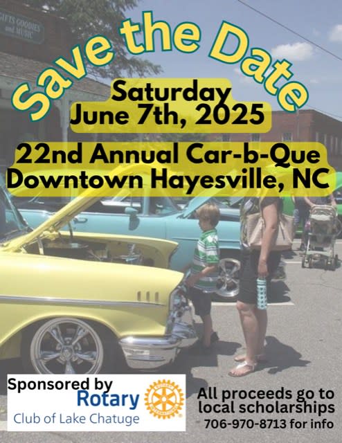Join us on the Square in downtown Hayesville on the first Saturday in June for the 22nd Annual Rotary Car-B-Que classic car show and barbeque dinner fundraiser. There is no cost to come and look at the cars! Proceeds from sponsorships, car registrations, and BBQ dinner sales support scholarships for local high school seniors. Here is the link for online registration: You can also use the form below to mail in with a check. For more information call 706-970-8713.