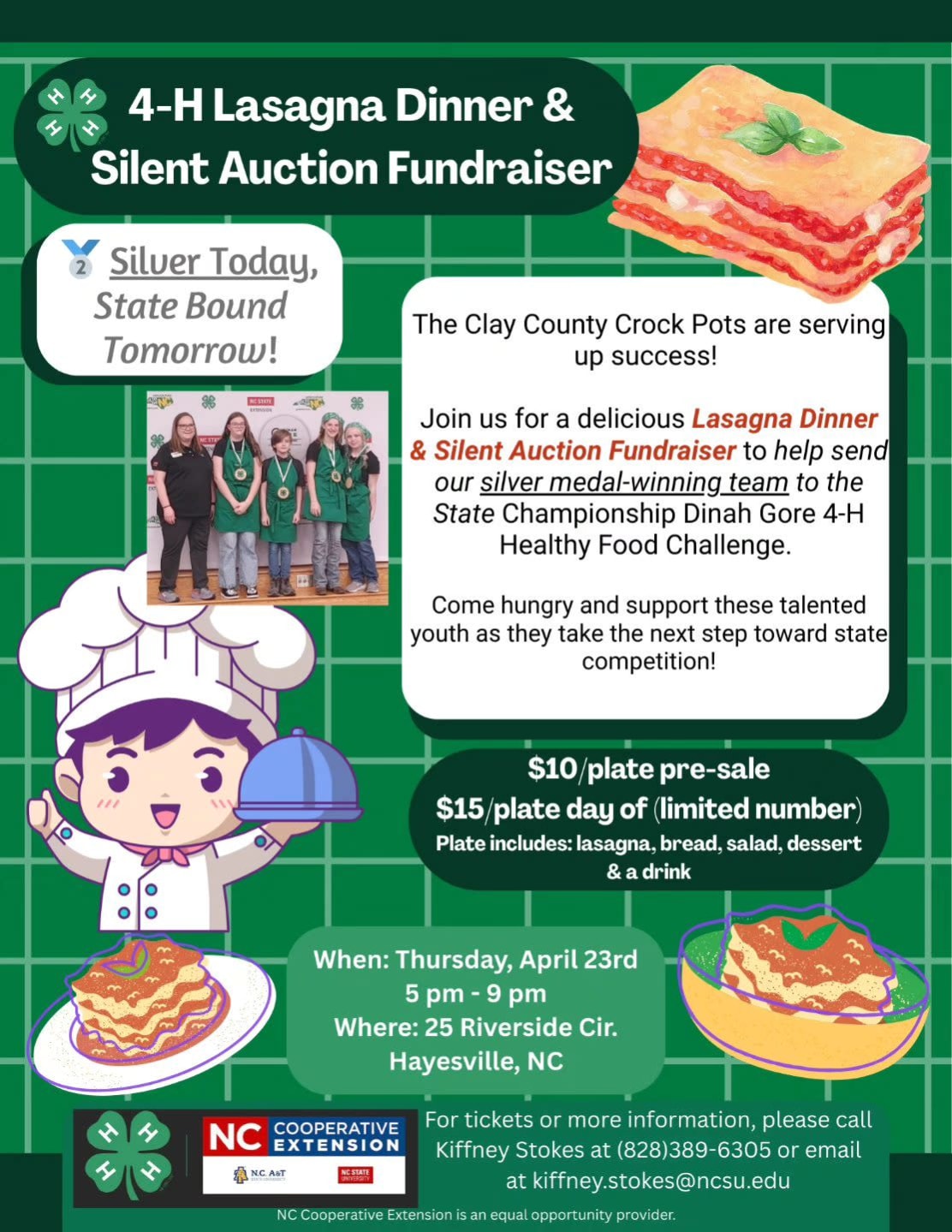 The Clay County Crock Pots cooking team is hosting a Lasagna Dinner & Silent Auction Fundraiser on April 23rd, from 5-9pm at 25 Riverside Circle in Hayesville. Community members are invited to come hungry and show their support for these talented youth as they take their next steps in competition. Plates include lasagna, bread, salad, dessert, and a drink, with pre-sale tickets available for $10 and a limited number of plates available the day of for $15. All proceeds will go toward helping the team travel to and compete at the state level.