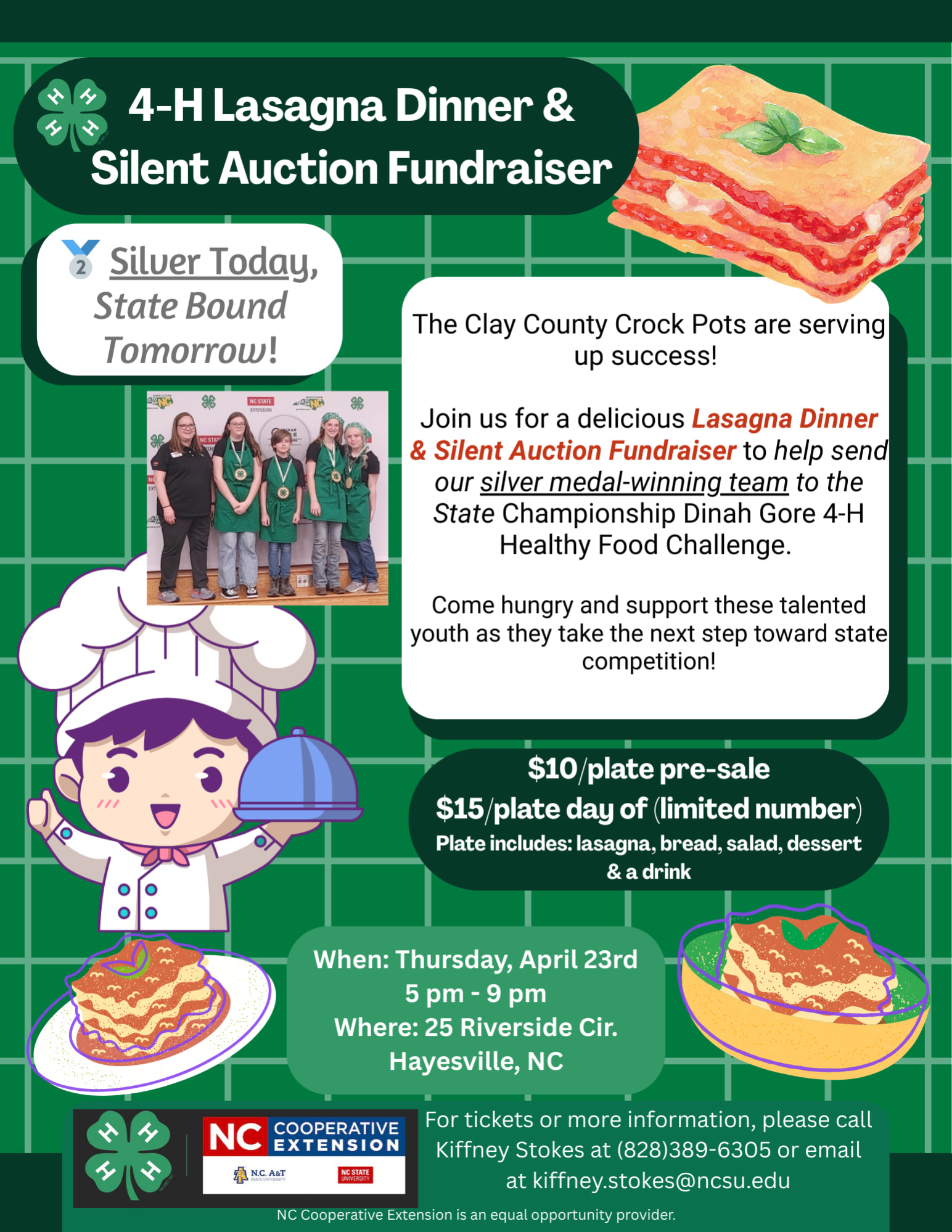 The Clay County Crock Pots are serving up success! Join us for a delicious Lasagna Dinner & Silent Auction Fundraiser to help send our Silver Medal-winning team to the State Championship Dinah Gore 4-H Healthy Food Challenge. Come hungry and support these talented youth as they take the next step toward state competition! $10 per plate pre-Sale~ $15 per plate day of (limited number). Plate includes lasagna, bread, salad, dessert & drink. For tickets or more information, please call Kiffany Stokes at (828) 389-6305 or email her at kiffany.stokes@ncsu.edu Brought to you by the NC Cooperative Extension!