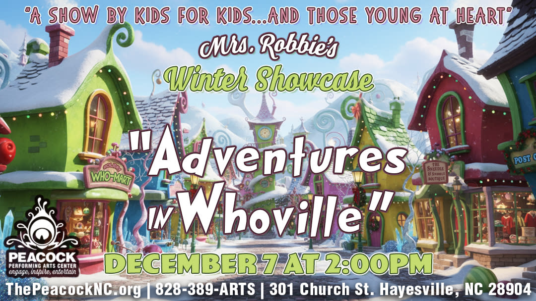 The Peacock presents Mrs. Robbie’s Winter Showcase: “Adventures in Whoville”. Join us Sunday, December 7th at 2:00 PM for a magical afternoon of fun, laughter, and holiday cheer! A show by kids, for kids — and the young at heart ❤️ Enjoy a whimsical journey through Whoville, filled with your favorite characters, beloved songs, and a surprise visit from the Grinch himself! Tickets are available now: https://peacockperformingartscenter.thundertix.com/. Come celebrate the season with a heartwarming story of love and friendship — Whoville-style! 🎄