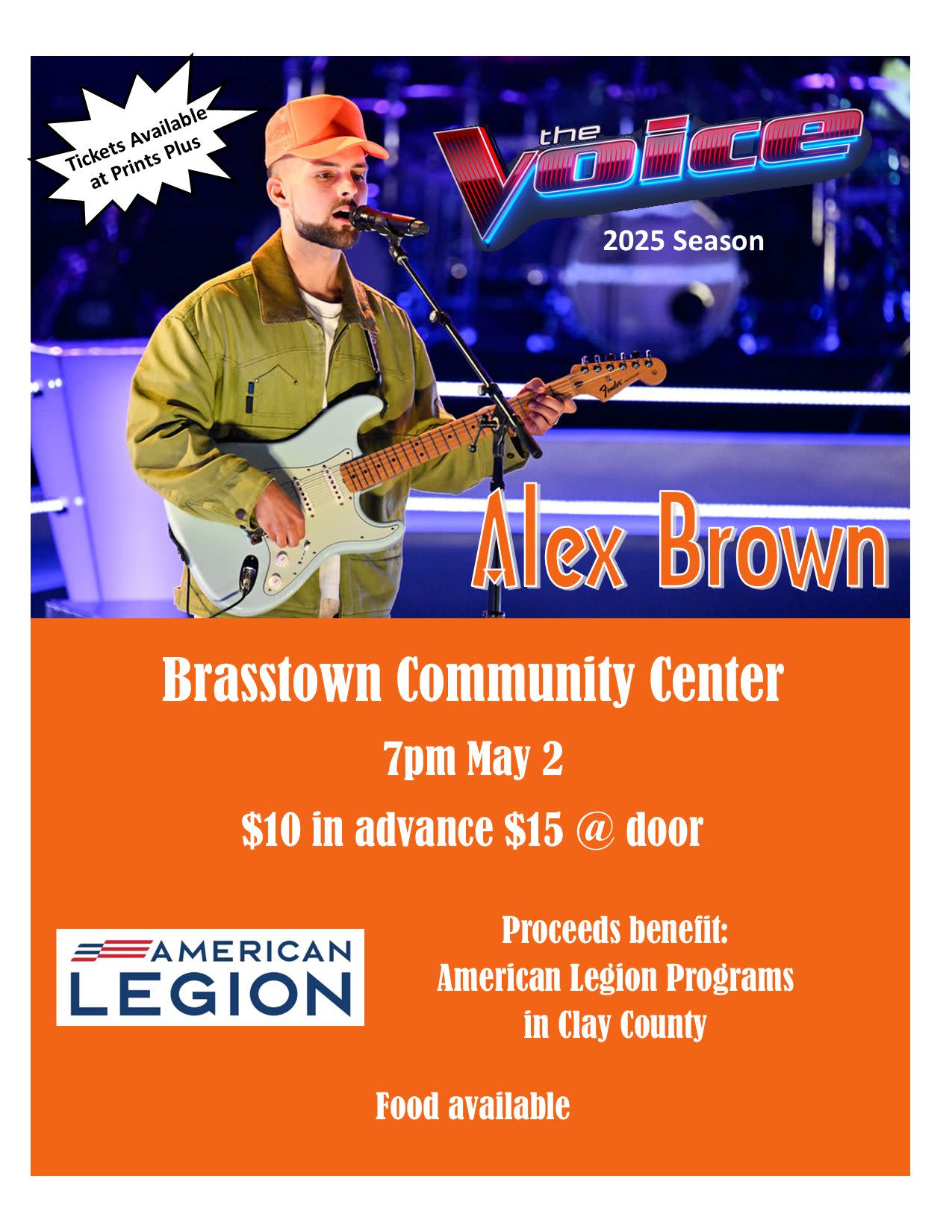 As seen on the 2025 Season of The Voice! $10 in advance; $15 at the door. Proceeds benefit American Legion programs in Clay County. Food available.
