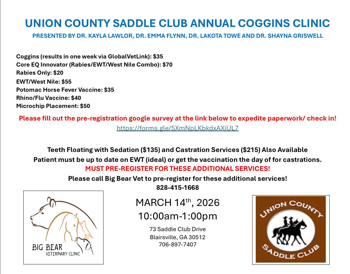EQUID FOLKS! It’s that time of year again. Union County Saddle Club is putting on their 2026 Coggins/Vaccine Clinic on March 14th and Big Bear will be providing the services. At Big Bear Vet we know that veterinary care can be expensive. These clinics allow us to provide much needed services to the horses in our area. We look forward to seeing everyone there. If you would like teeth done, then please call the Big Bear office to pre-register.