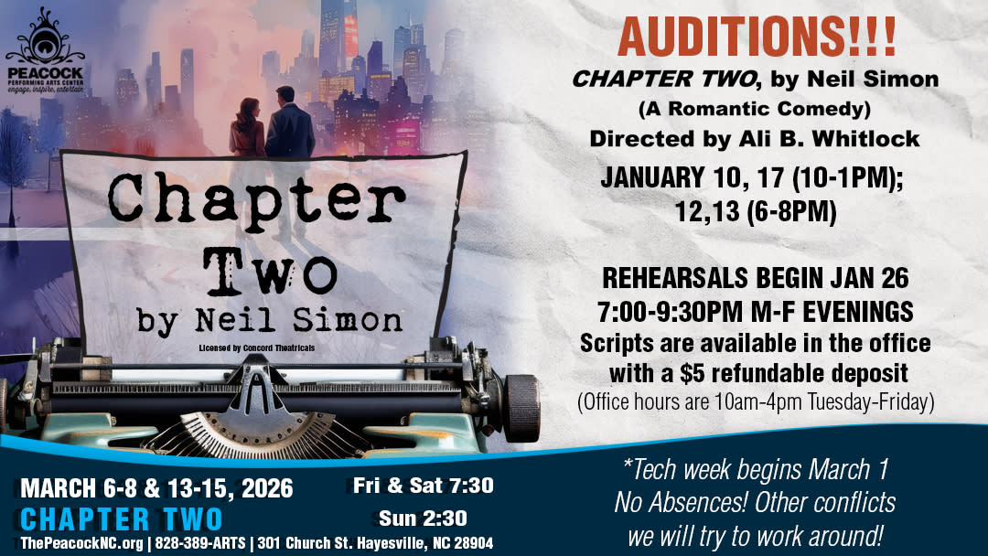 The Peacock Performing Arts Center is excited to announce AUDITIONS for CHAPTER TWO, the touching and hilarious romantic comedy by Neil Simon, directed by Ali B. Whitlock! Get all the info on this and all upcoming auditions here: https://www.thepeacocknc.org/get_involved.