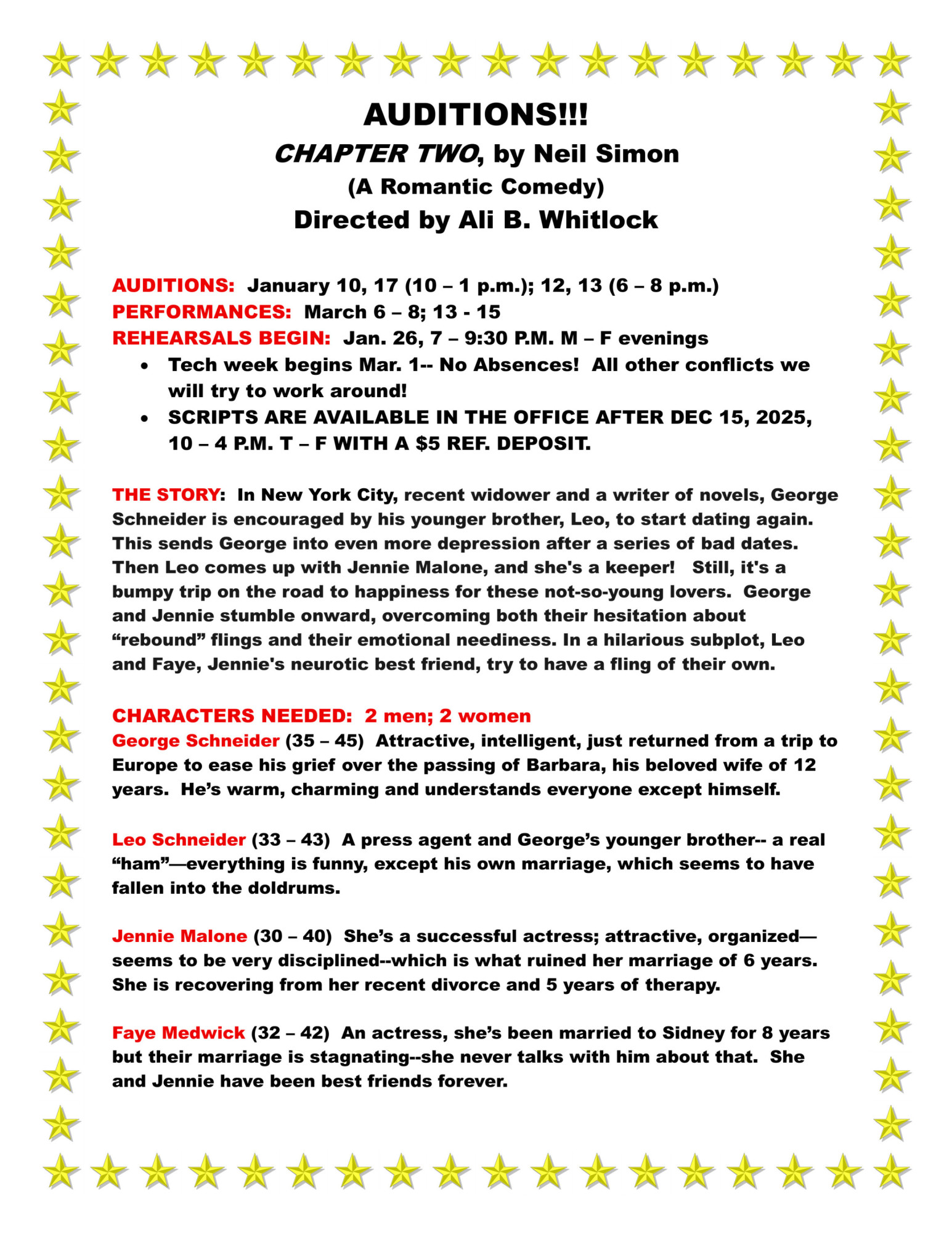 AUDITIONS FOR "CHAPTER TWO" - PEACOCK PERFORMING ARTS CENTER