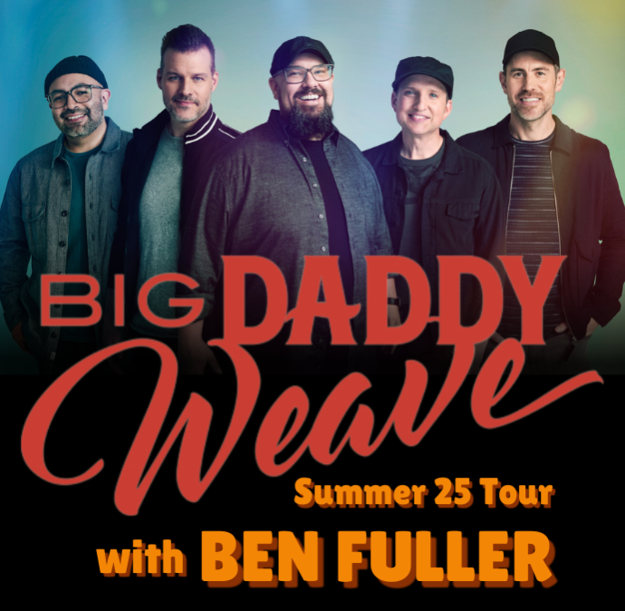 Known for honest songs that tell personal stories of freedom in Christ, Big Daddy Weave has long been admired for their real-life, real-person openness. With songs like Redeemed, God Is In This Story, Heaven Changes Everything, My Story, The Lion and the Lamb, Overwhelmed, and Let It Begin, Big Daddy Weave has become one of the most beloved bands in Christian music. Millions have taken their anthems of the chain-breaking love of Jesus as their own and sung along to songs about the radical act of redemption. The band’s openness to go through whatever doors God opens for them has kept them going since their early days as students at the University of Mobile. Big Daddy Weave’s testimony is about a deep and personal faith in Jesus, no matter the circumstances. A mainstay at radio, the band has achieved multiple No. 1 singles. RIAA Platinum-certified Redeemed became an anthem of unprecedented impact when it spent 11 weeks at No. 1, was dubbed “Song of the Year” at the first annual K-LOVE Fan Awards, and earned Dove Award and Billboard Music Award nominations. Their follow-up hit, “The Lion and The Lamb,” has become one of the genre’s most-streamed songs. Big Daddy Weave members are Mike Weaver (lead vocals, guitar), Jeremy Redmon (guitar, vocals), Joe Shirk (saxophone, keys, vocals), Brian Beihl (drums), and Raul Alfonso (bass). They have amassed more than one billion career streams and have received numerous honors, including a Dove Award, ASCAP and BMI Awards, and the prestigious Rich Mullins Artist Impact Award, among others.