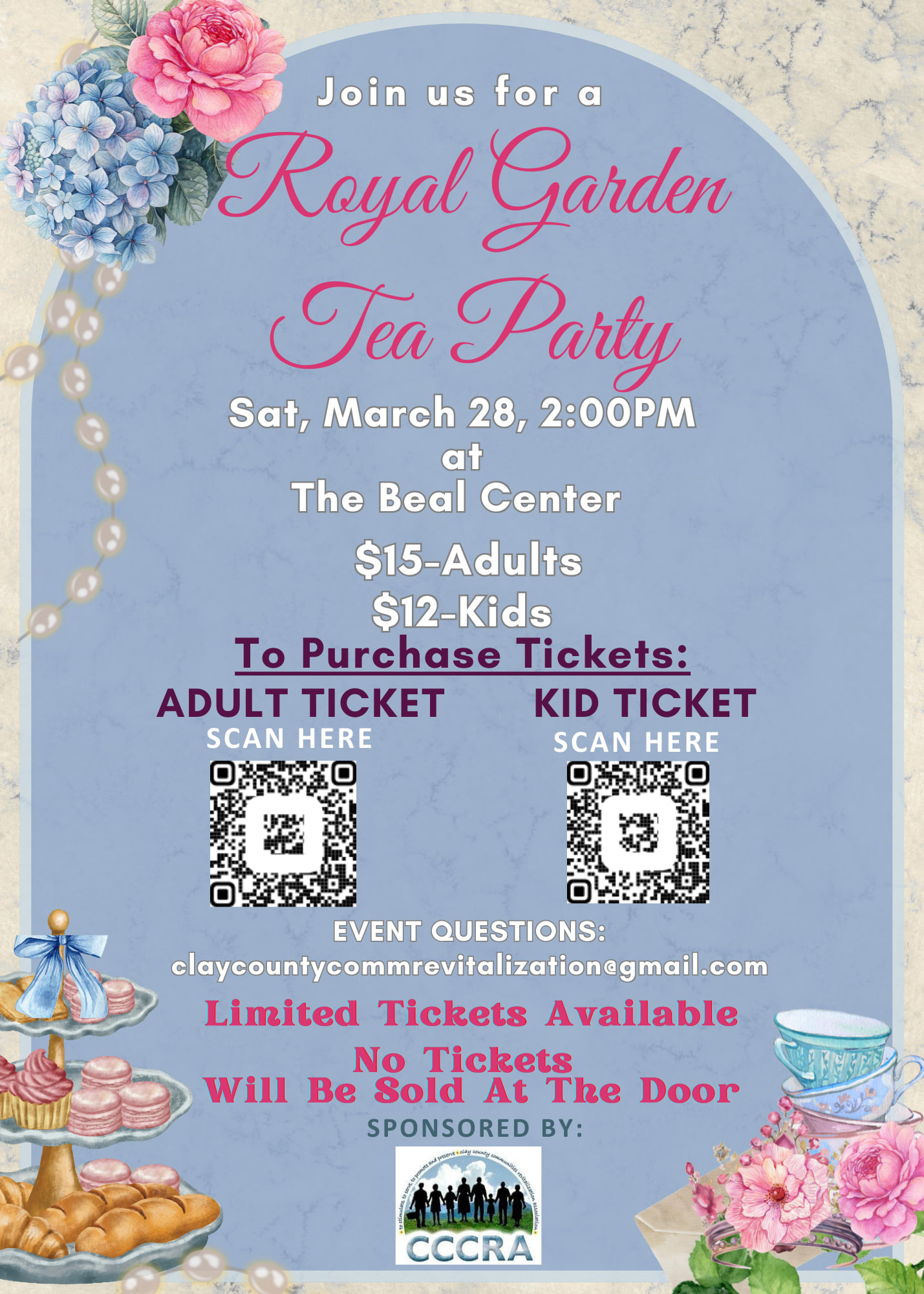 You’re Invited to a Royal Tea Party! CCCRA is thrilled to host this year's Royal Tea Party at The Beal Center. MARCH 28th, 2:00 PM The Beal Center 25 Herbert Street Hayesville, NC 28904 Enjoy a magical afternoon filled with tea-time treats, delightful sweets, princesses and princes, and royal fun for all ages. All guests are encouraged to dress in their finest royal attire—but it’s not required! We can’t wait to welcome you for an afternoon fit for royalty! Click the links below or scan the QR code on the invite. Adults: $15: Click Here to Purchase: https://square.link/u/oGUz2hWn Children: $12: Click Here to Purchase: https://square.link/u/OoXhEXj0 LIMITED TICKETS AVAILABLE DUE TO SPACE NO TICKETS SOLD AT DOOR! Event Or Ticket Questions: Claycountycommrevitalization@gmail.com