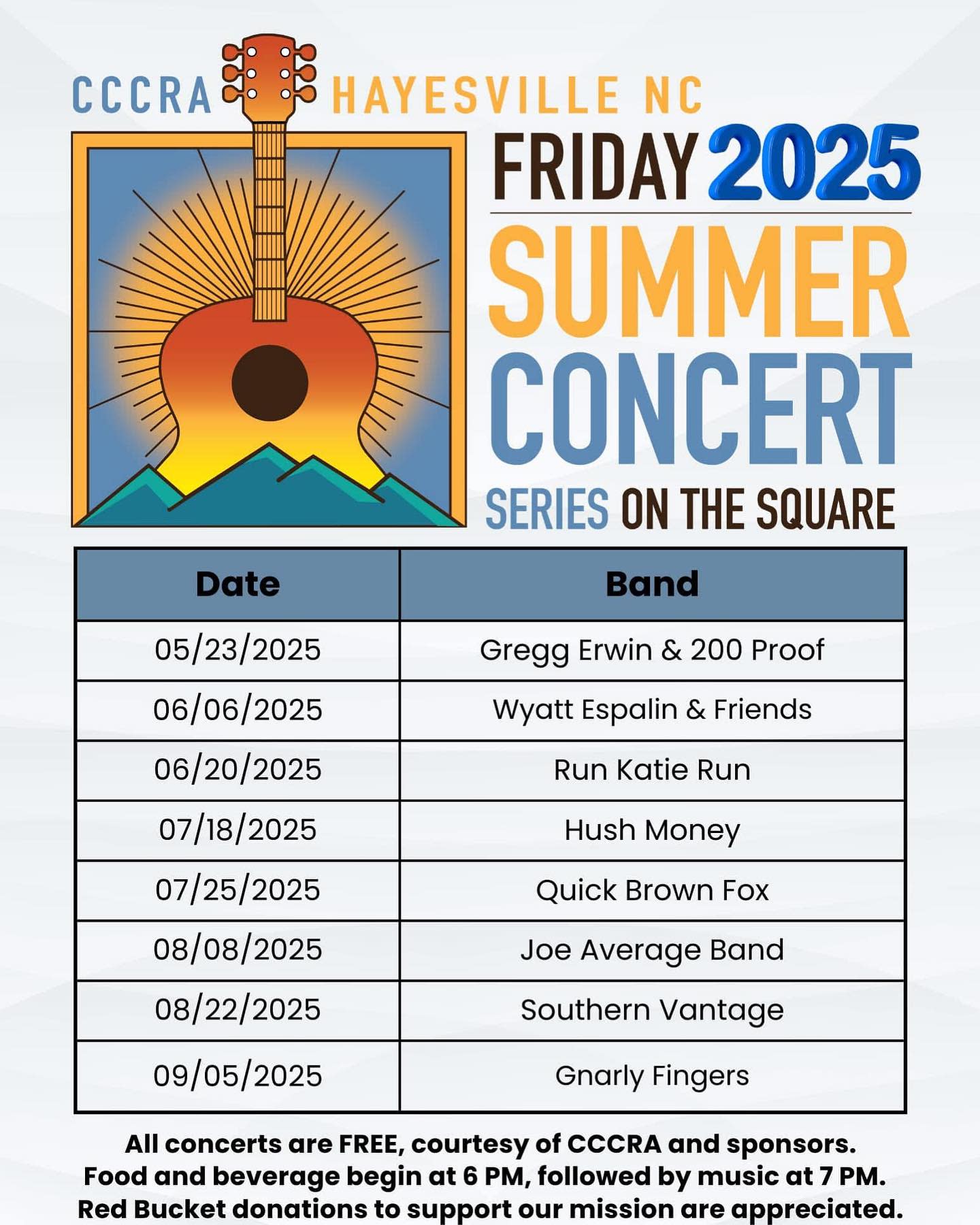 It’s time to mark those Friday Nights on your calendar for our 2025 Summer Concert Series! All concerts are FREE, courtesy of CCCRA and sponsors. Food and beverages begin at 6:00 p.m. followed by music at 7 p.m. Red Bucket donations to support our mission are appreciated.