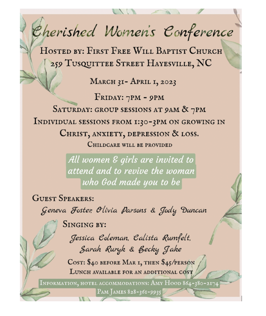 Event for all Women & Girls with Sessions on growing in Christ, anxiety, depression & loss. Guest Speakers: Geneva Foster, Olivia Parsons & Jody Duncan Singing by Jessica Coleman, Calista Rumfelt, Sarah Ruryk & Becky Jake Cost $40 before 3/1, then $45 pp after. Lunch available for additional cost