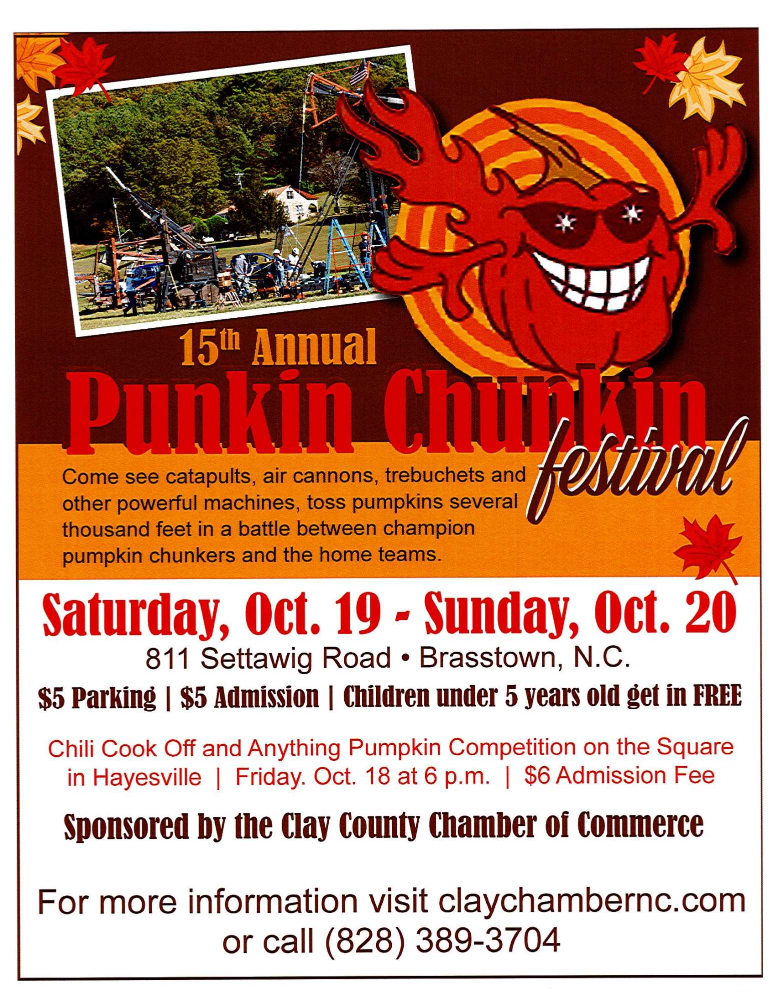Punkin Chunkin weekend kicks off on Friday evening with the “Anything Pumpkin” and Chili Cook-off competition on the Historic Hayesville Square. Tickets will be sold on a first-come first-serve basis at the event. Please come and enjoy the music and dine out at our many restaurants located on the historic downtown square. Entry forms available at the Chamber and online.