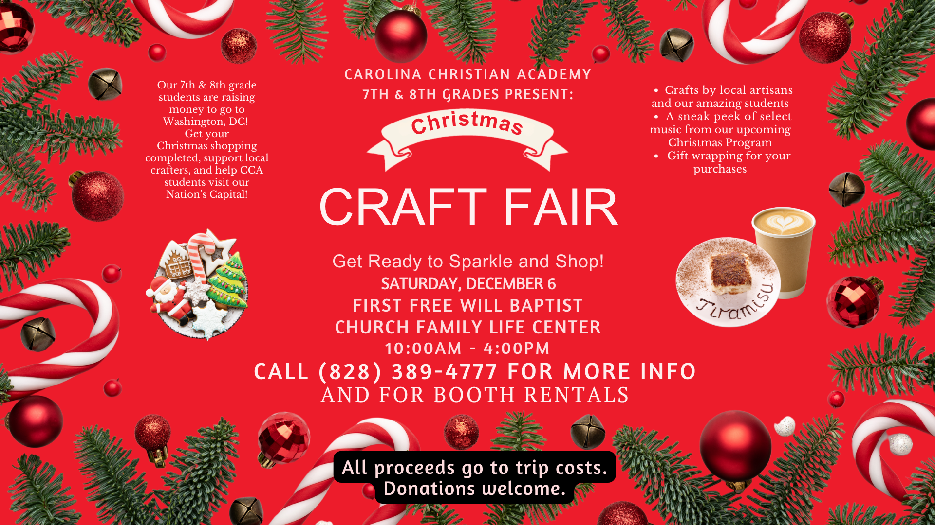 ALl proceeds go to Carolina Christian Academy for Our 7th & 8th grade students are raising money to go to Washington, DC! Get your Christmas shopping completed, support localcrafters, and help CCA students visit our Nation's Capital! Crafts by local artisans and our amazing students A sneak peek of select music from our upcoming Christmas Program Gift wrapping for your purchases
