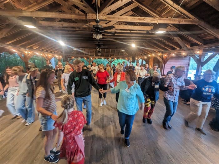 Join us, MONDAY, July 14, at 7 p.m. in Keith House Community Room for a one-hour concert with dance to follow. The supergroup performance features Betsy Branch on fiddle, Peter Siegel plays guitar, banjo, and mandolin, Jared Kirkpatrick on piano, and Rick Mohr on rhythm. These fine musicians will be joined by seasoned dance caller, Gaye Fifer, along with her student mentees for nightly public dances from July 12 – 18 as part of our annual Dance Musicians’ and Callers’ weeks founded by David Kaynor. Chairs will be moved, and a dance will commence shortly after 8 p.m. Saturday, July 12, from 7 p.m. to 10 p.m., we host a monthly Second Saturday big community contra dance in historic Keith House Community Room. The band will be Branch, Siegel, Kirkpatrick, and Mohr. Dances to be taught and called by Gaye Fifer. All are welcome; no partner necessary. This will serve as a Dance Musicians’ Week Kickoff Party. Sunday, July 13, from 2 p.m. to 4:30 p.m., we host a monthly English Country dance. The band will be Branch, Siegel, Kirkpatrick, and Mohr. Dances to be taught and called by Gaye Fifer. This event will welcome a large group of out-of-town adult musicians, students, and callers. If it is your first-time trying English country dancing, be on time for simple walkthroughs and instruction on the easier dances. Tuesday and Wednesday July 15 and 16, dancing will go from about 7 p.m. to 9 p.m. featuring student bands and callers. Thursday, July 17, the party moves up the hill to the Crown Restaurant for a free open community jam session at 7 p.m. followed by a dance in the plywood solar pavilion at 8 p.m. Friday night, July 18 we’ll have a Craft Social in and around Keith House starting at 7 p.m. Bring a project to work on at the Craft Corner or stop by to see instructor work. The Community room will have dancing starting at 7:30 p.m. A donation of $5-15 per adult is suggested for some of the events, but all are welcome regardless of contribution. Any funds raised help with equitable pay for performers. The Folk School will host nightly public dances from July 12 to 18 as part of our annual Dance Musicians’ and Callers’ weeks founded by David Kaynor. Chairs will be moved, and a dance will commence shortly after 8 p.m.