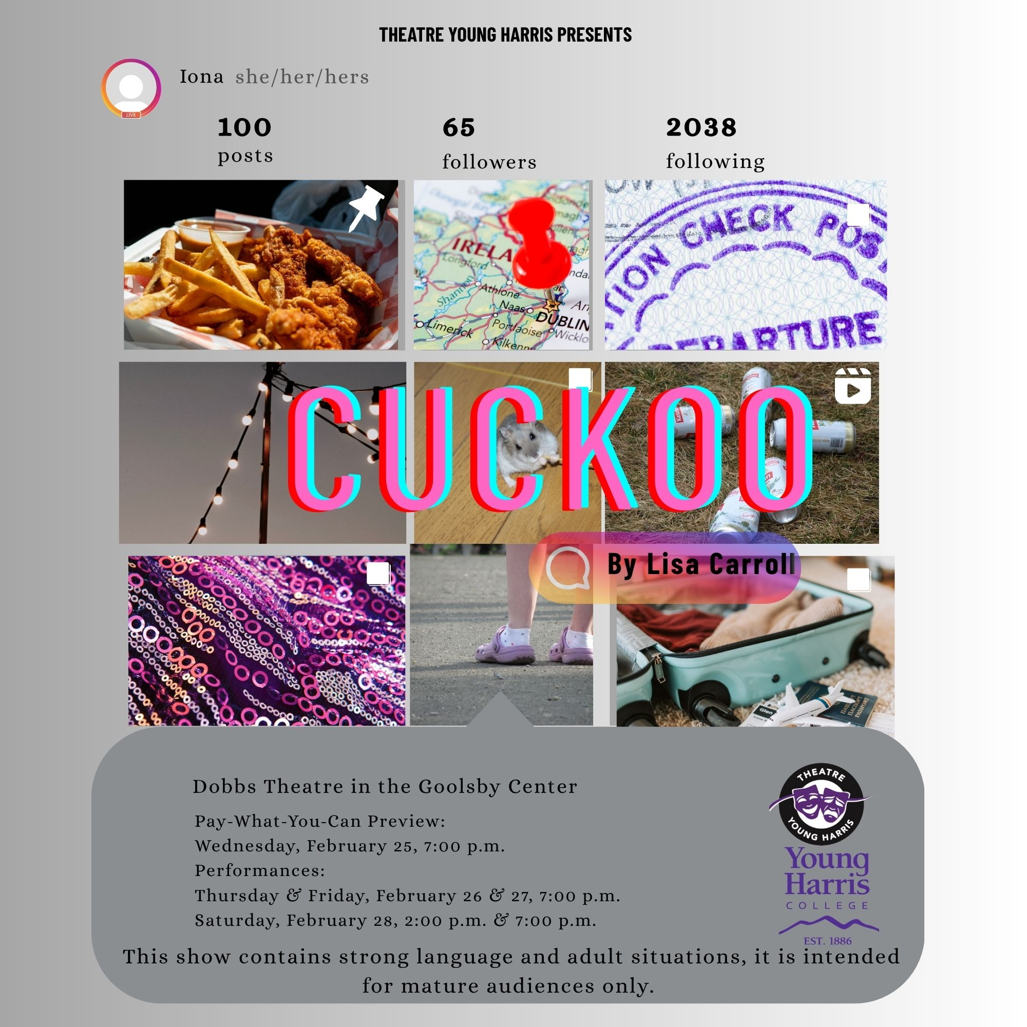 "CUCKOO" by Lisa Carroll: Content advisory: alcohol, language, and mild adult themes. Texas Fried Chicken. Abject misery. A one-way Ryanair ticket. Welcome to Cuckoo—a darkly funny, fiercely honest, and bitingly modern story of youth, identity, and escape. Packed with pop culture references from Kylie Jenner lip kits to Lucozade, this bold debut by Lisa Carroll offers a raw and relatable look at what it means to be young in Ireland today. Shortlisted for the prestigious Papatango New Writing Prize, Cuckoo is a sharp and sparkling play that unpacks the price of fitting in—and the courage it takes to fly the nest. Pay what you can Preview on Feb. 25, Dobbs Theatre in the Goolsby Center. Minimum donation of $1 Performances on Feb. 26. 27 & 28 at 7 p.m. Dobbs Theatre in the Goolsby Center.