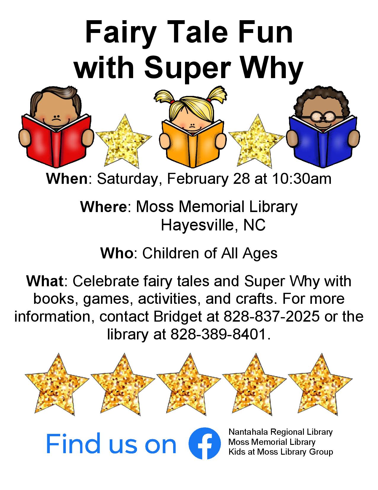 Children of all ages are invited to celebrate fairy tales and Super Why with books, games, activities, and crafts. For more information about these events, contact Bridget at 828-837-2025 or bwilson@nrlibrary.org or the library at 828-389-8401.
