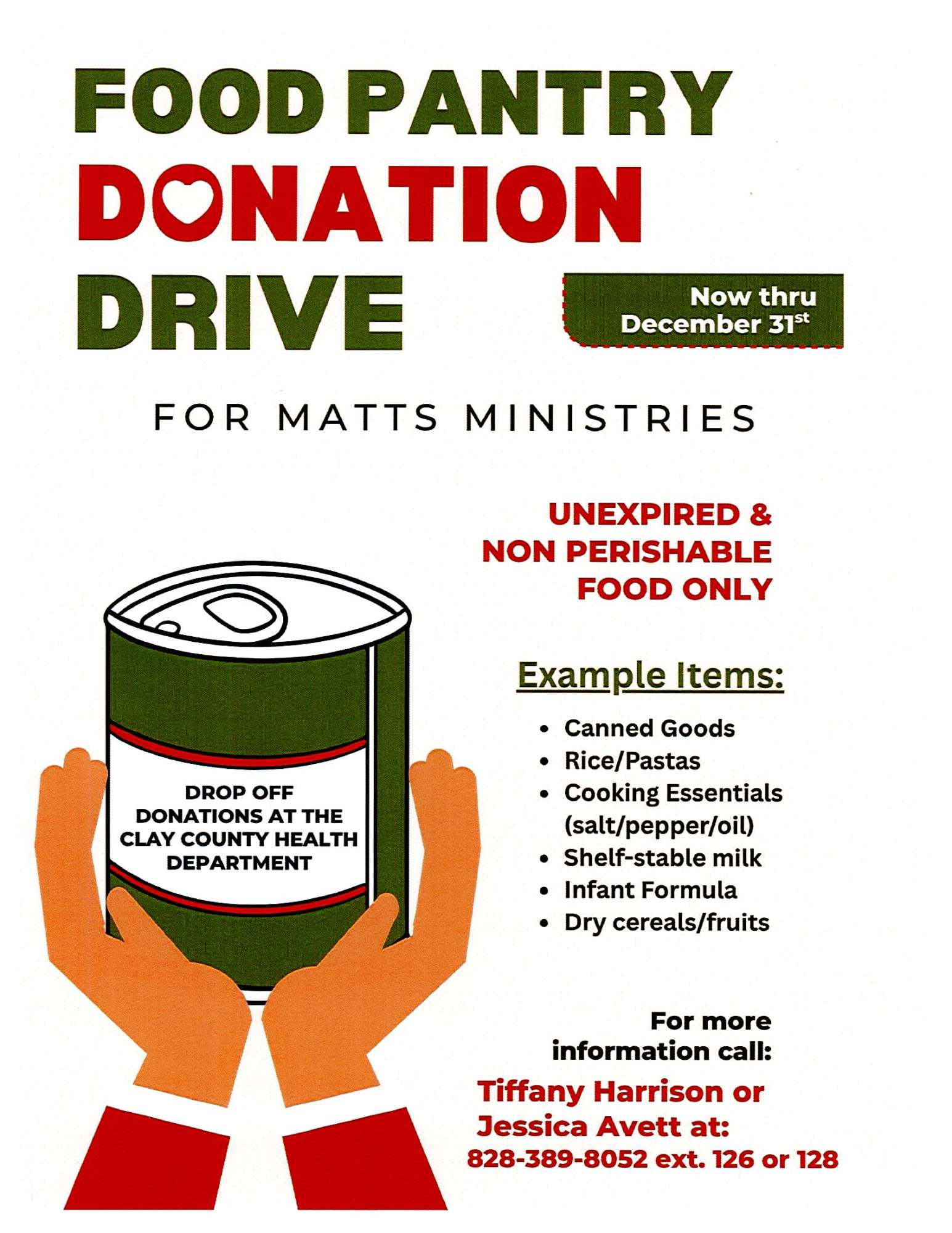 Now through December 31st. Unexpired and nonperishable food only. Drop off donations at Clay County Health Department.