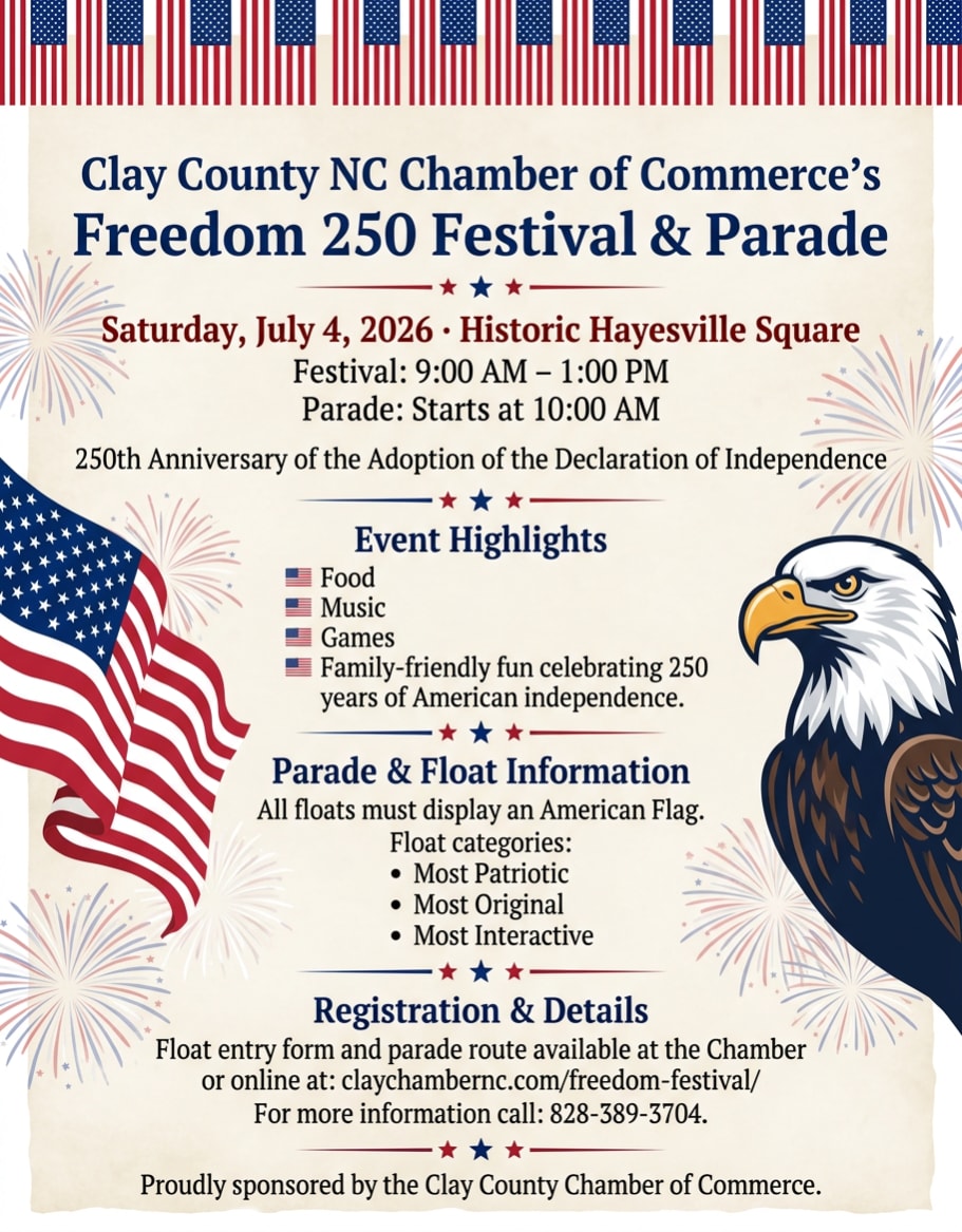 Experience the joy of American independence at the Freedom 250 Festival & Parade, a day filled with patriotism, community spirit, and unforgettable memories. Join us at the Historic Beal Center Courthouse Square from 9:00 AM to 1:00 PM for a day of celebration. The parade kicks off at 10:00 AM. Don't miss this chance to honor 250 years of American independence with your community. Exciting Games! Participate in fun games and activities designed for the whole family, ensuring an entertaining day for everyone. Patriotic Parade! Watch as creative floats and community groups parade through the streets, celebrating our nation's heritage. Memorable Moments! Create lasting memories with loved ones as we honor 250 years of freedom and look forward to the future. Community Spirit! Connect with friends and neighbors as we come together to celebrate this momentous occasion in our nation's history. Visit our website to download the parade route & application if you'd like to be IN the parade. https://www.claychambernc.com/freedom-festival/