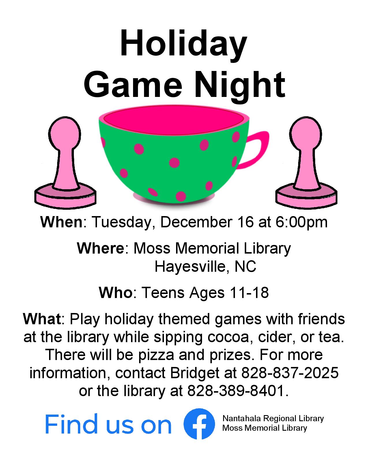 Teens ages 11-18 are invited to play holiday themed games with friends at the library while sipping cocoa, cider, or tea. There will be pizza and prizes. For more information about these events, contact Bridget at 828-837-2025 or bwilson@nantahalalibrary.org or the library at 828-389-8401.