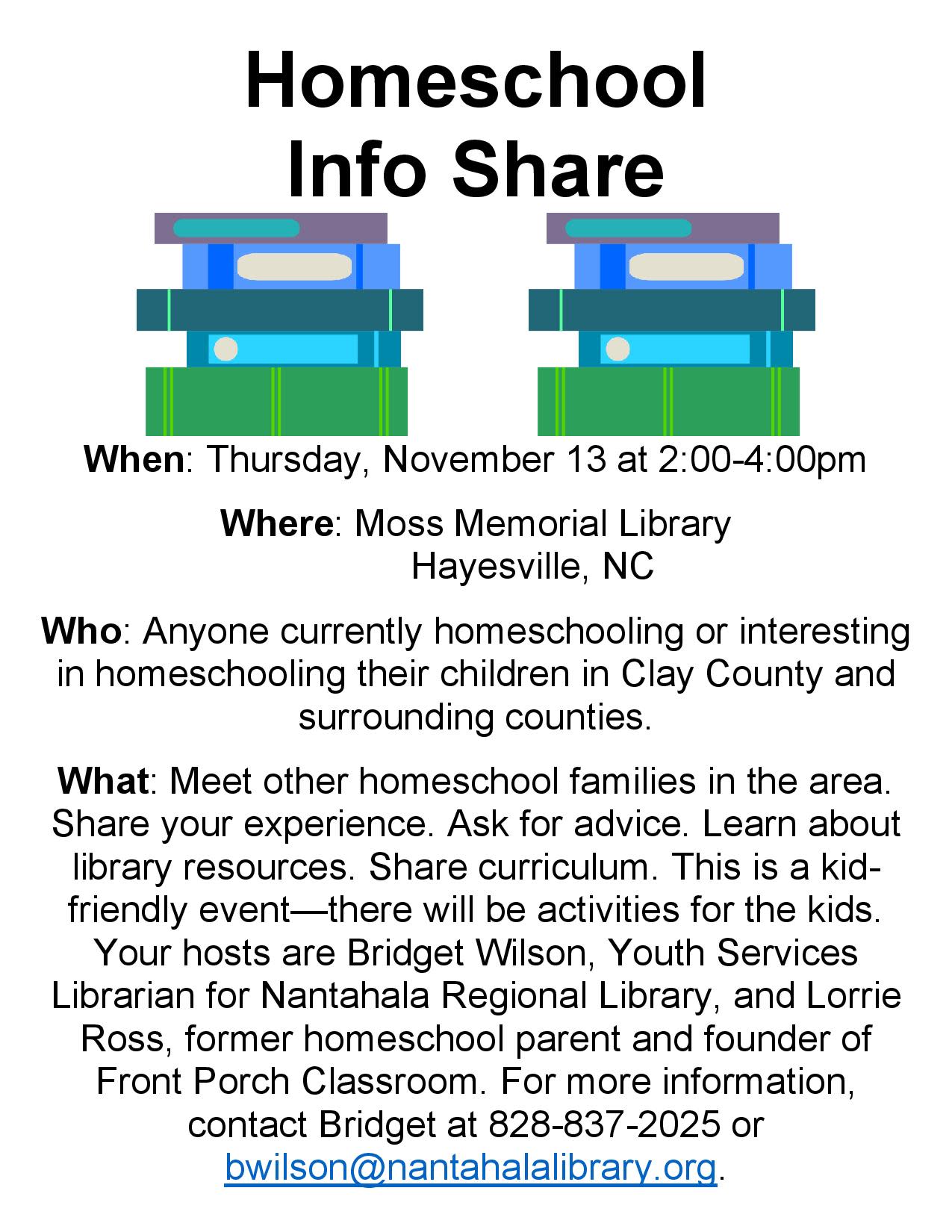 Anyone currently homeschooling or interesting in homeschooling their children in Clay County and surrounding counties. Meet other homeschool families in the area. Share your experience. Ask for advice. Learn about library resources. Share curriculum. This is a kid-friendly event—there will be activities for the kids. Your hosts are Bridget Wilson, Youth Services Librarian for Nantahala Regional Library, and Lorrie Ross, former homeschool parent and founder of Front Porch Classroom. For more information, contact Bridget at 828-837-2025 or bwilson@nantahalalibrary.org.