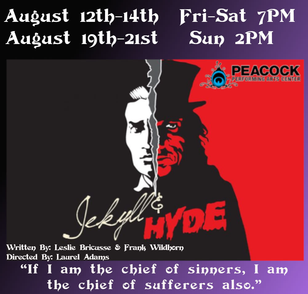 GOTHIC MUSICAL by Frank Wildhorn & Leslie Bricusse – Based on the classic story by Robert Louis Stevenson, this is the tale of two men – one, a doctor, passionate and romantic; the other, a terrifying madman – and two women – one, beautiful and trusting; the other, beautiful and trusting only herself– both women in love with the same man and both unaware of his dark secret. A devoted man of science, Dr. Henry Jekyll is driven to find a chemical breakthrough that can solve some of mankind’s most challenging medical dilemmas. Rebuffed by the powers that be, he decides to make himself the subject of his own experimental treatments, accidentally unleashing his inner demons along with the man that the world would come to know as Mr. Hyde.