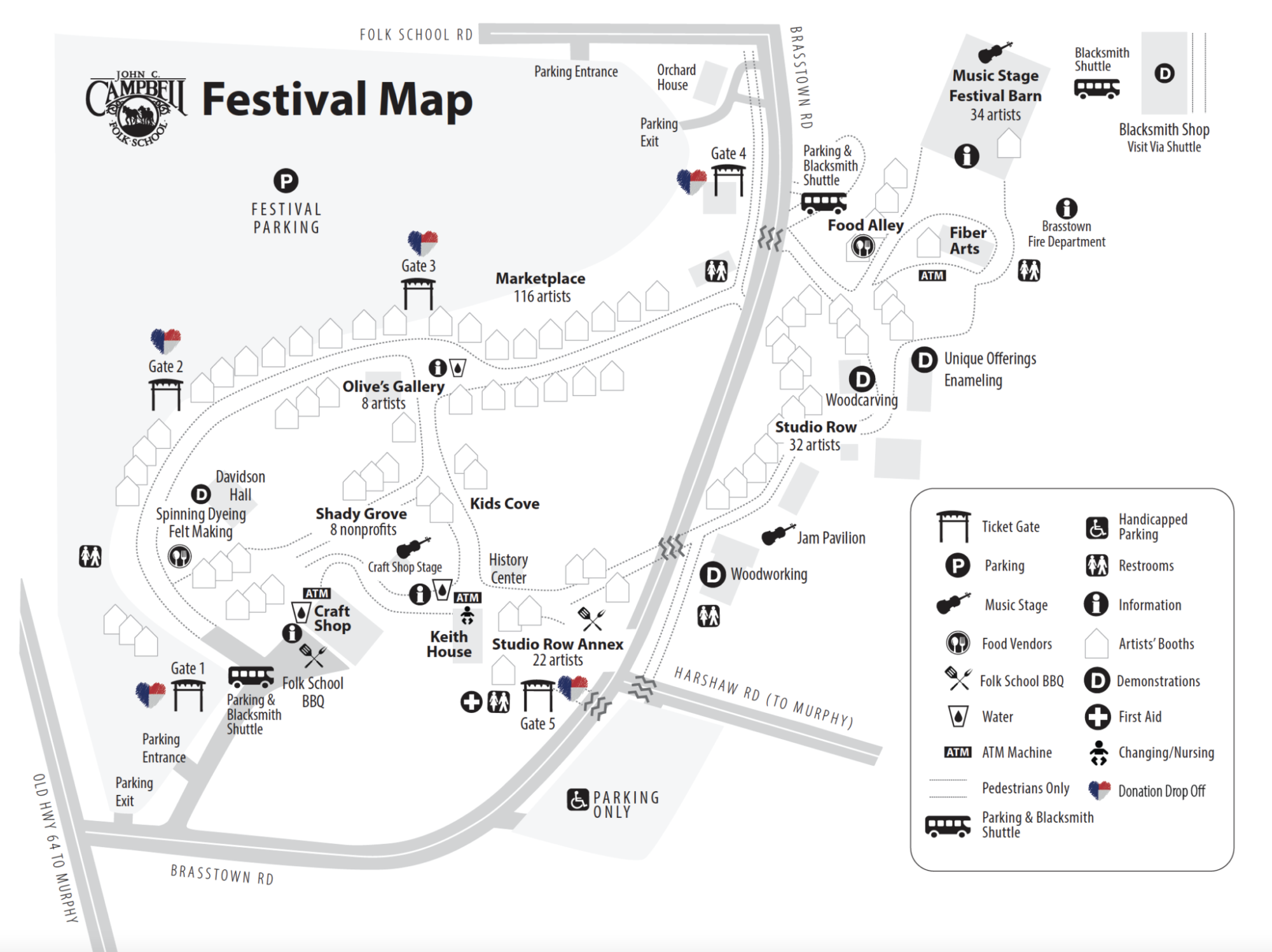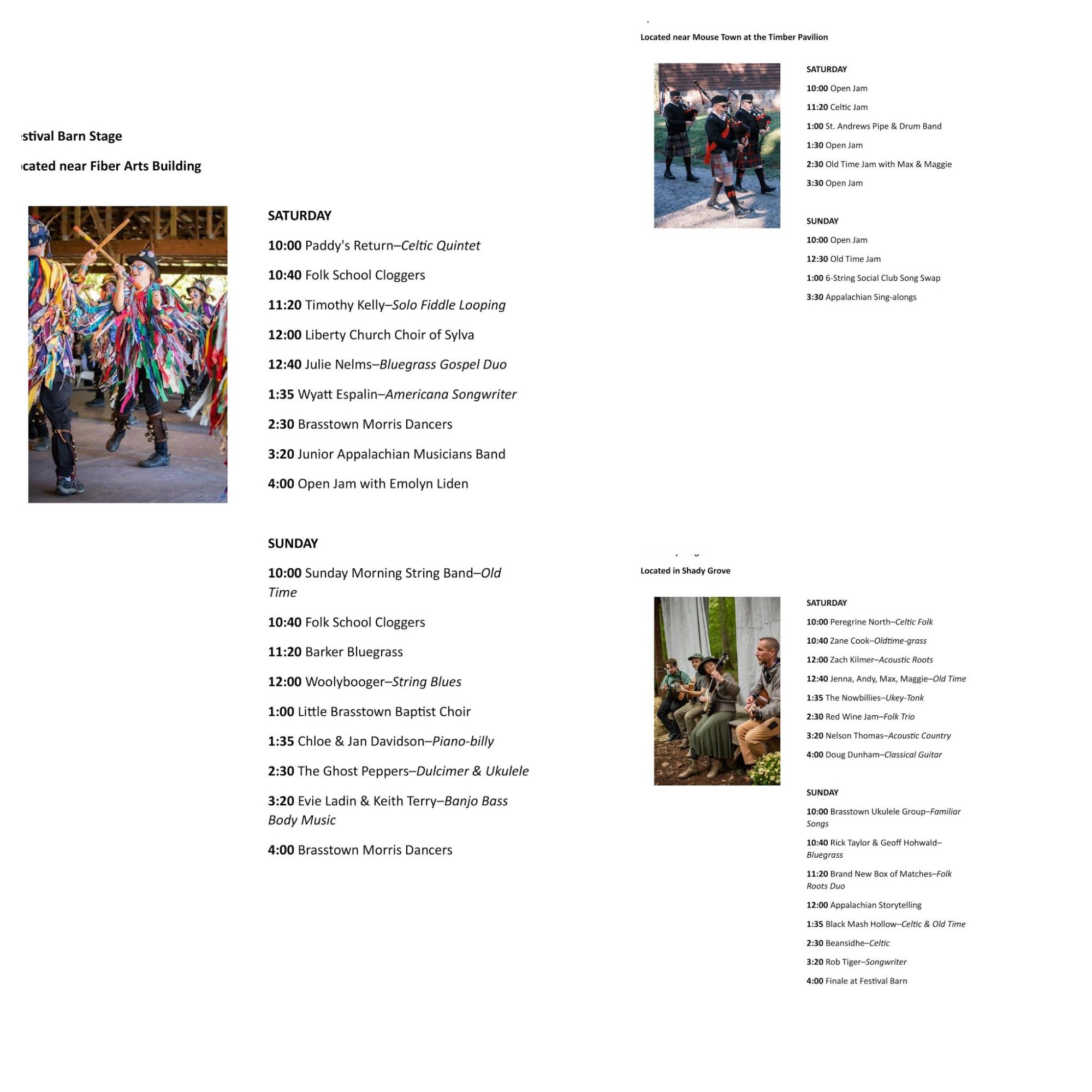 Update: Supporting Western North Carolina Hurricane Relief Effort. https://www.folkschool.org/2024/09/29/helene-update/ Join us for our 48th annual Fall Festival on Saturday, October 5, and Sunday, October 6, from 10 a.m. to 5 p.m. on the Folk School's Brasstown, NC campus. A premier destination since 1974, the Folk School’s Fall Festival attracts thousands from across the region for an extraordinary celebration of Appalachian craft, culture, and heritage. Visit fine craft exhibitors tucked along the school’s winding wooded paths and watch artisans demonstrate traditional and contemporary crafts. Fill your ears with traditional roots music, and tap your toes to clogging, Morris, and other dance performances. Enjoy good food, kids' activities, and more. Saturday, October 5 Fiber Arts – Davidson Hall Parking Lot 10-10:45 a.m. – Brenda Williams, Spinning Woodworking – Woodworking Studio Porch 10-10:45 a.m. – Sammy Long, Woodturning Blacksmithing – Clay Spencer Blacksmithing Shop 11-11:45 a.m. – Larry Cooper, Blacksmithing Unique Offerings – Enameling Studio 10-10:45 a.m. – Suzy Deslauriers, Watercolor Brasstown Carvers – Woodcarving Studio Sunday, October 6 Fiber Arts – Davidson Hall Parking Lot 10-10:45 a.m. – Kaylee Todd, Hand Carding/Spinning Woodworking – Woodworking Studio Porch 10-10:45 a.m. – Steve Cox, Woodturning Blacksmithing – Clay Spencer Blacksmithing Shop 11-1:45 a.m. – Cam Plunkett, Blacksmithing Unique Offerings – Enameling Studio 10-10:45 a.m. – Brent Barnes, Throwing Jugs Brasstown Carvers – Woodcarving Studio