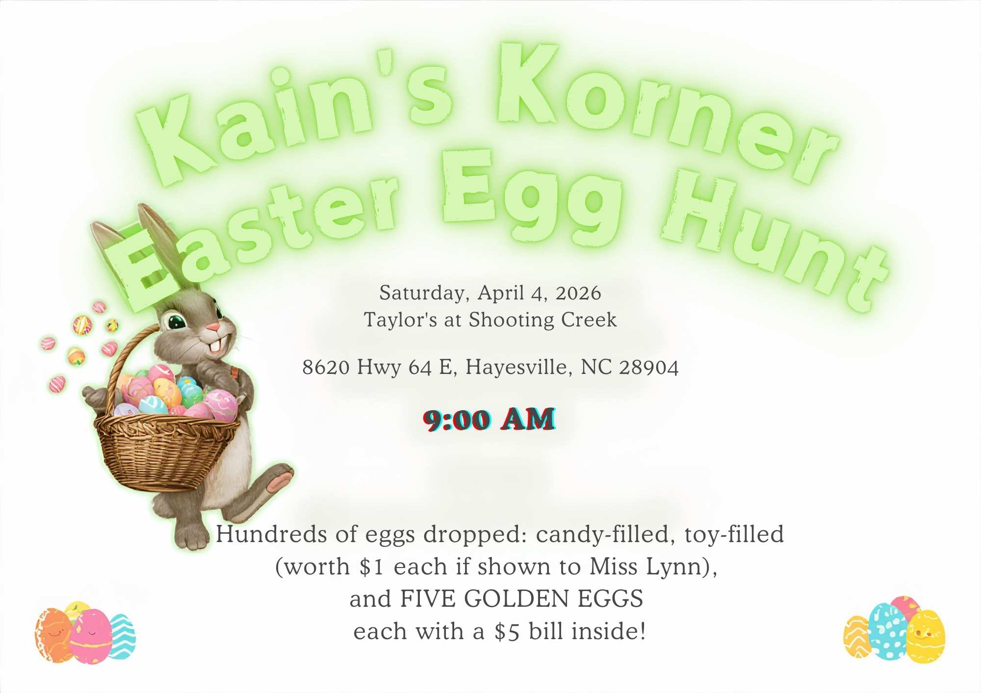 Stop in at Kain's Korner, Taylor's @ Shooting Creek on Saturday, April 4 @ 9:00am for a free Easter Egg Hunt! Hundreds of eggs filled with candy, toys and 5 with cash! Fun for the whole family!! Lynn Hodgins Taylor https://taylorsatshootingcreek.com