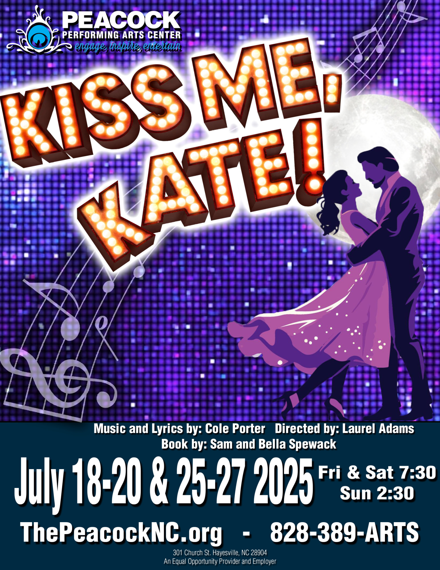 Kiss Me, Kate Music & Lyrics by Cole Porter, Book by Bella and Samuel Spewack Showings: Adult: $37.50 – Senior 65+/Military/Student: $31.50 – 8 & Under: $12.50 “Brush Up Your Shakespeare…” is just one of the familiar songs in this dazzling Broadway classic that earned the very first Tony Award for Best Musical! Don’t worry: it’s not all Shakespeare—The Taming of the Shrew is the play within the play—but the odd thing is that the exact plot of the Shakespearean play is what is happening backstage to the actual modern-day actors! Throw in a couple of gangsters, mistaken identities and comedy routines and you have “Another op’nin’, Another Show” Come join us for a night of local performing arts at the Peacock Performing Arts Center!