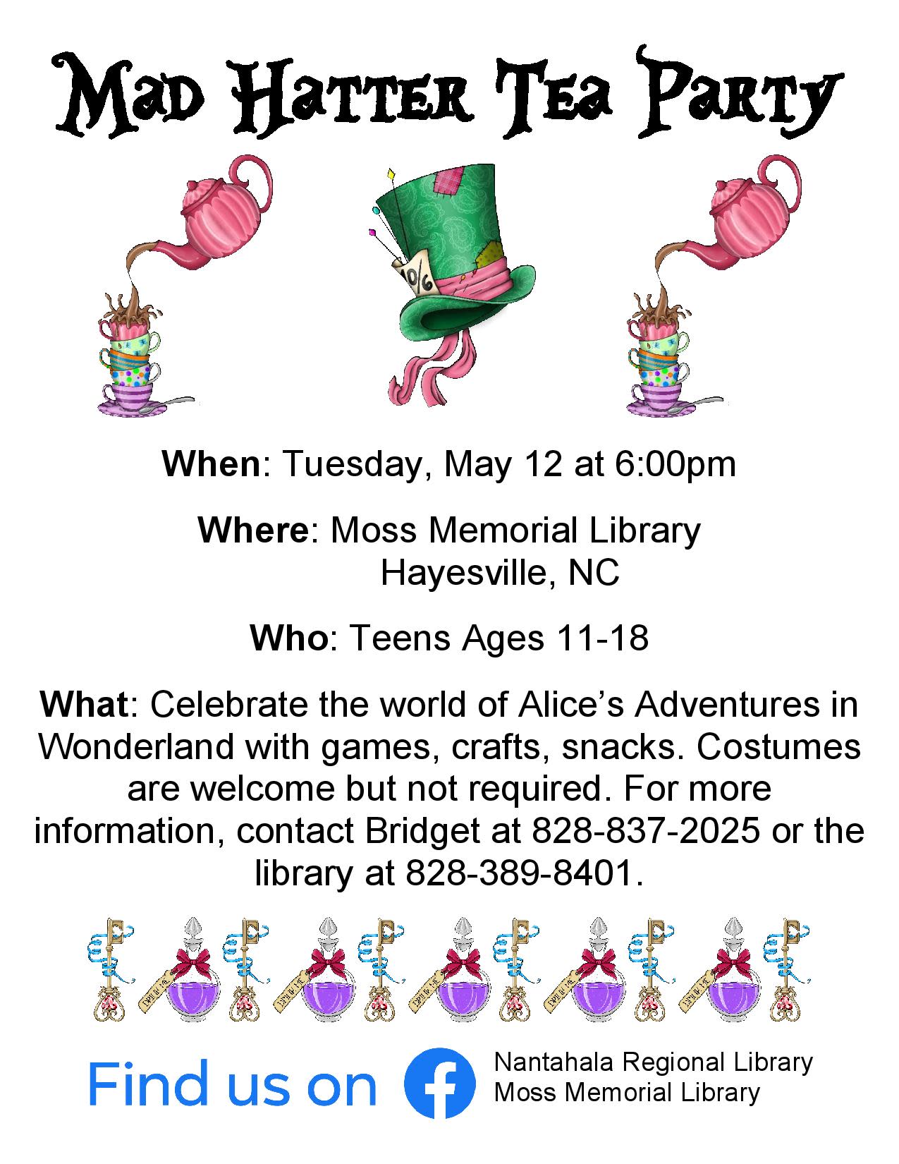 Teens ages 11-18 are invited to celebrate the world of Alice’s Adventures in Wonderland with games, crafts, snacks. Costumes are welcome but not required. For more information, contact Bridget at 828-837-2025 or the library at 828-389-8401.
