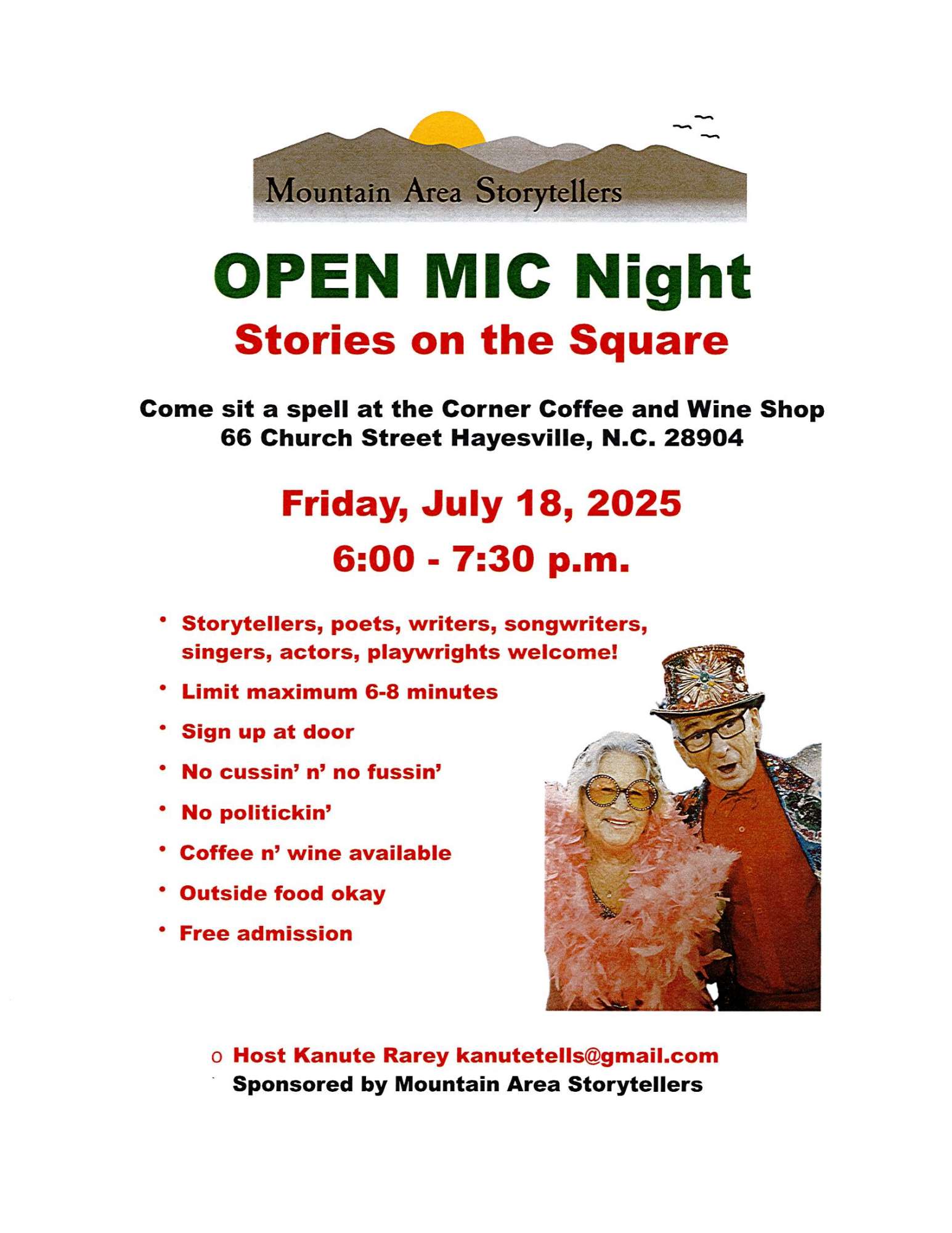 Welcome to our OPEN MIC. Come out and see. Watch for local performances coming your way regularly. Welcoming storytellers, writers, musicians and singer songwriters. Experienced or beginner. Sign up at the door. Take the stage. Eight minutes each. Coffee and wine available. Outside food acceptable. Free admission. More information: kanutetells@gmail.com.