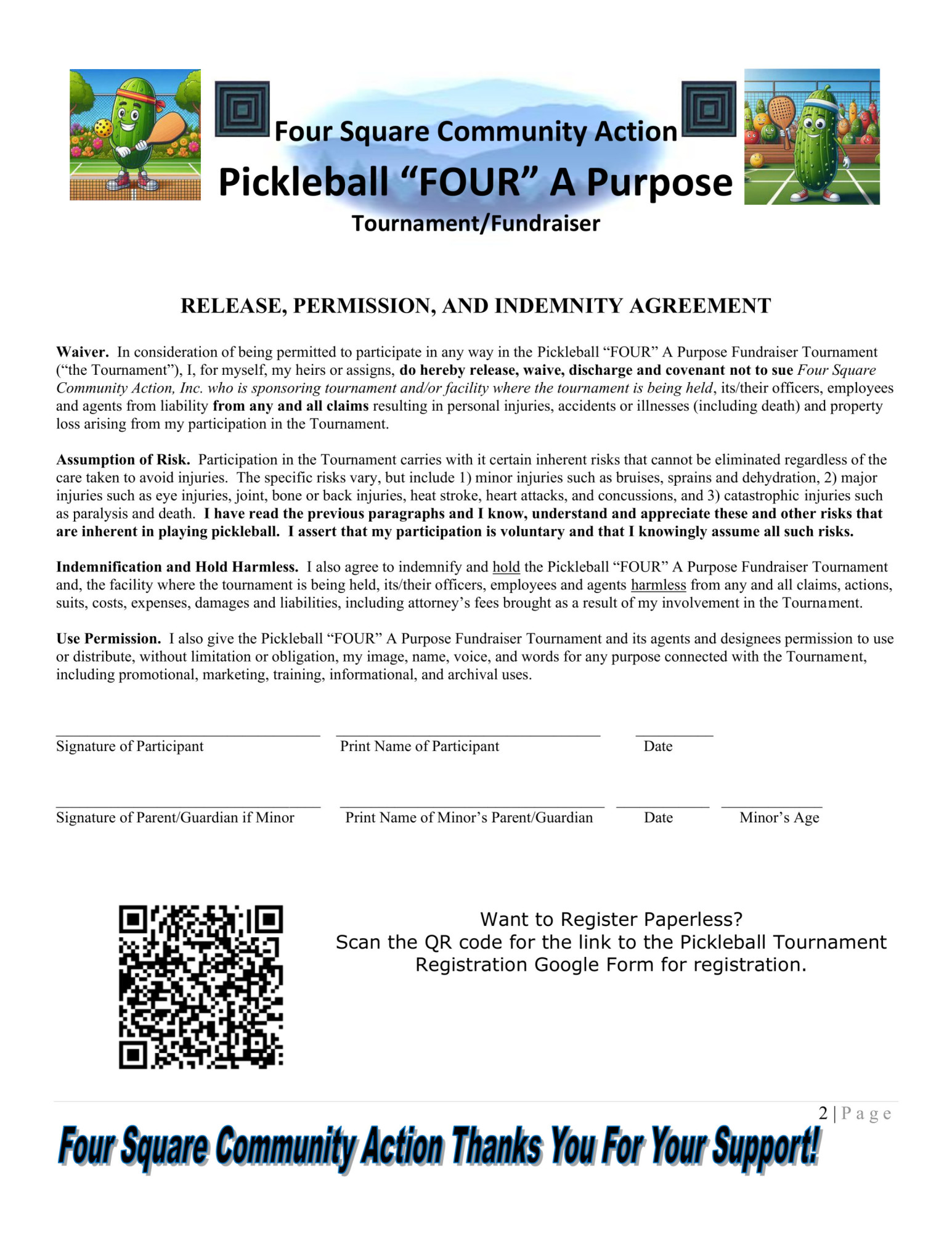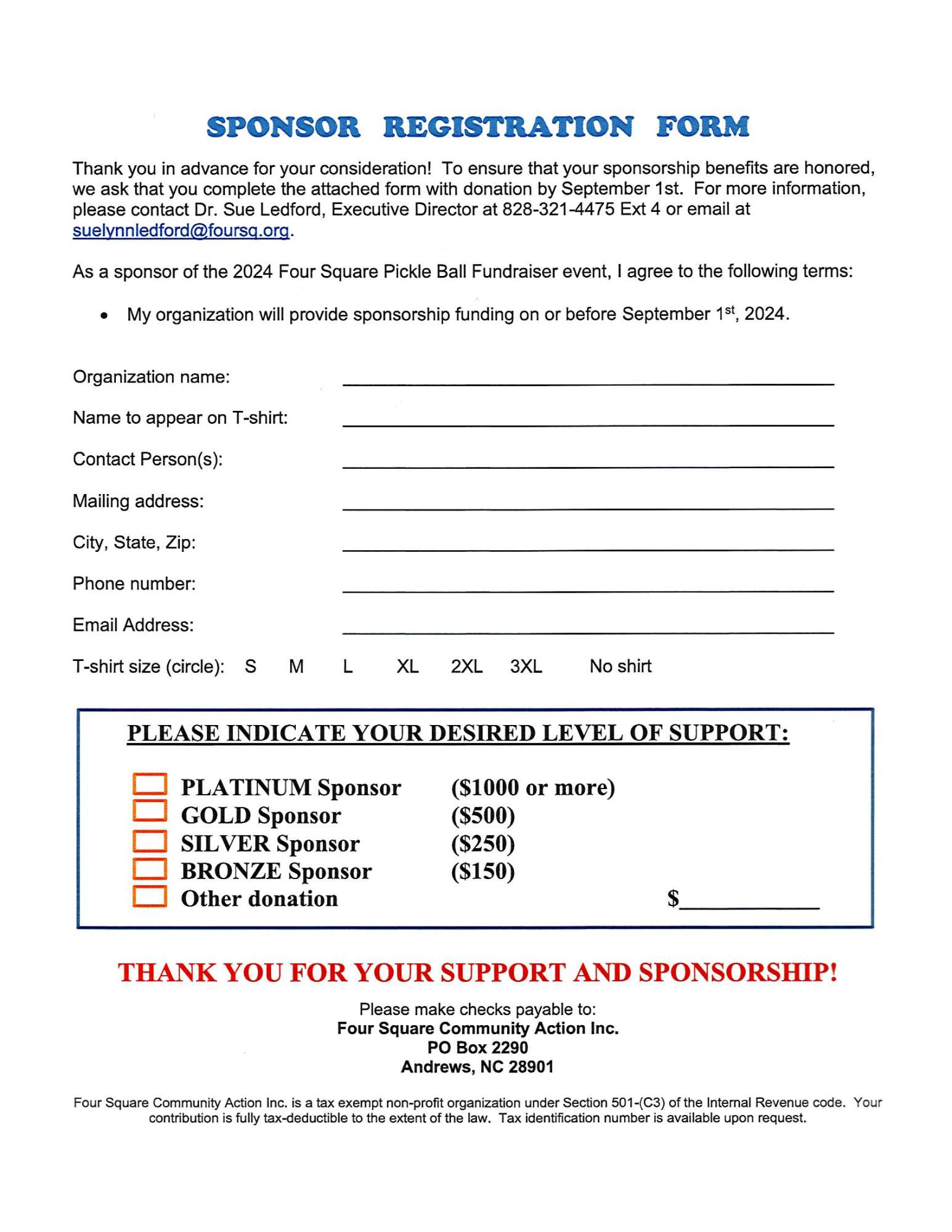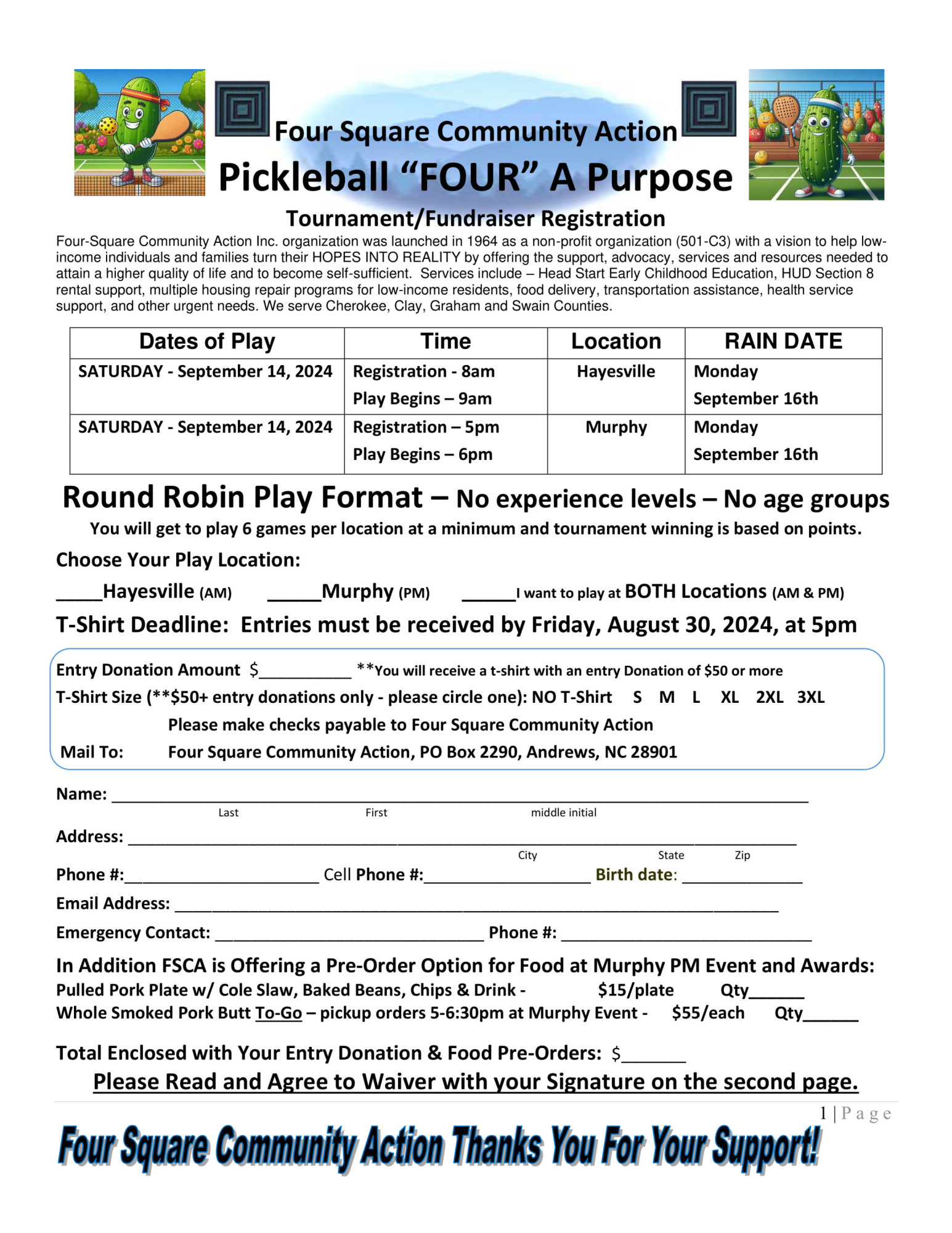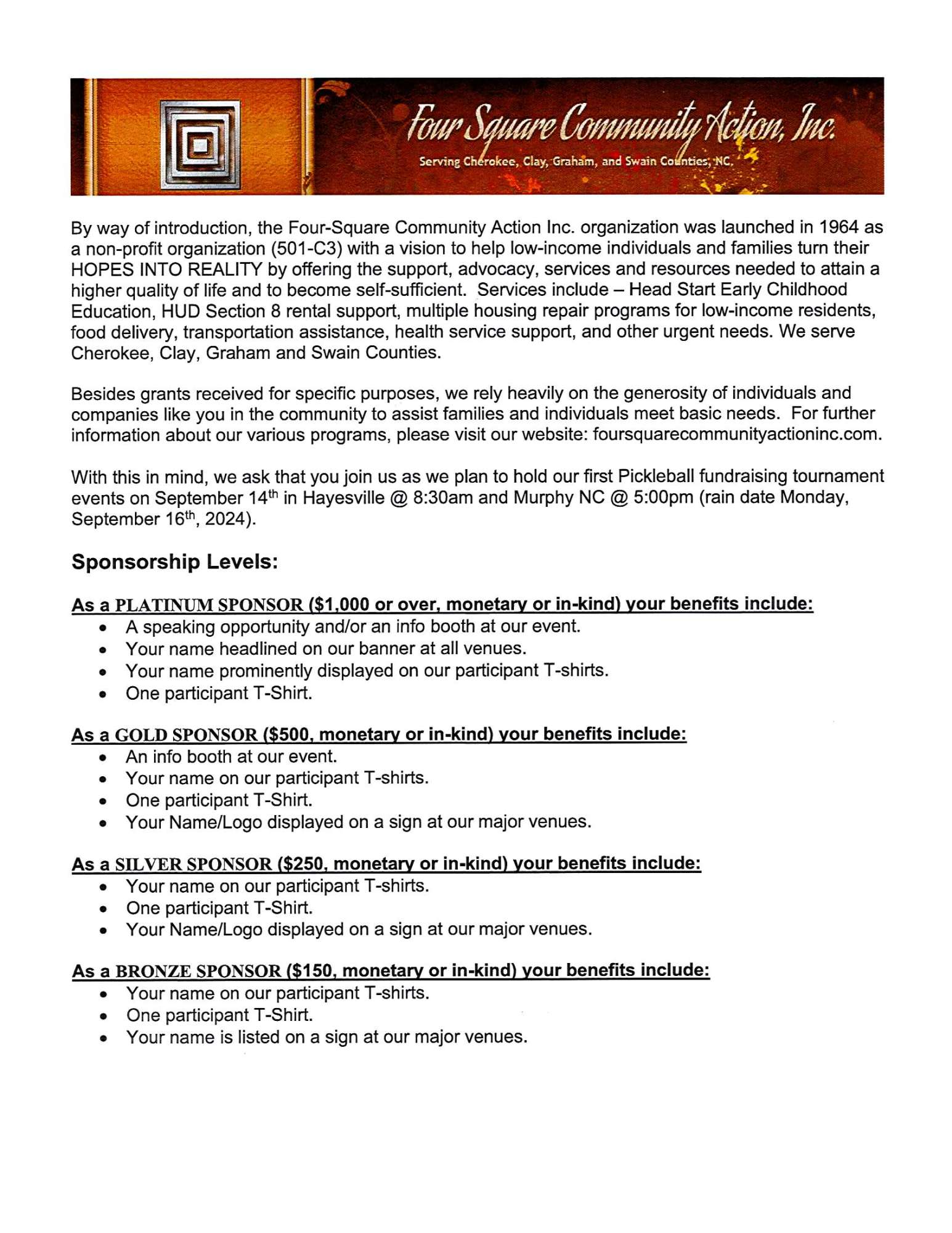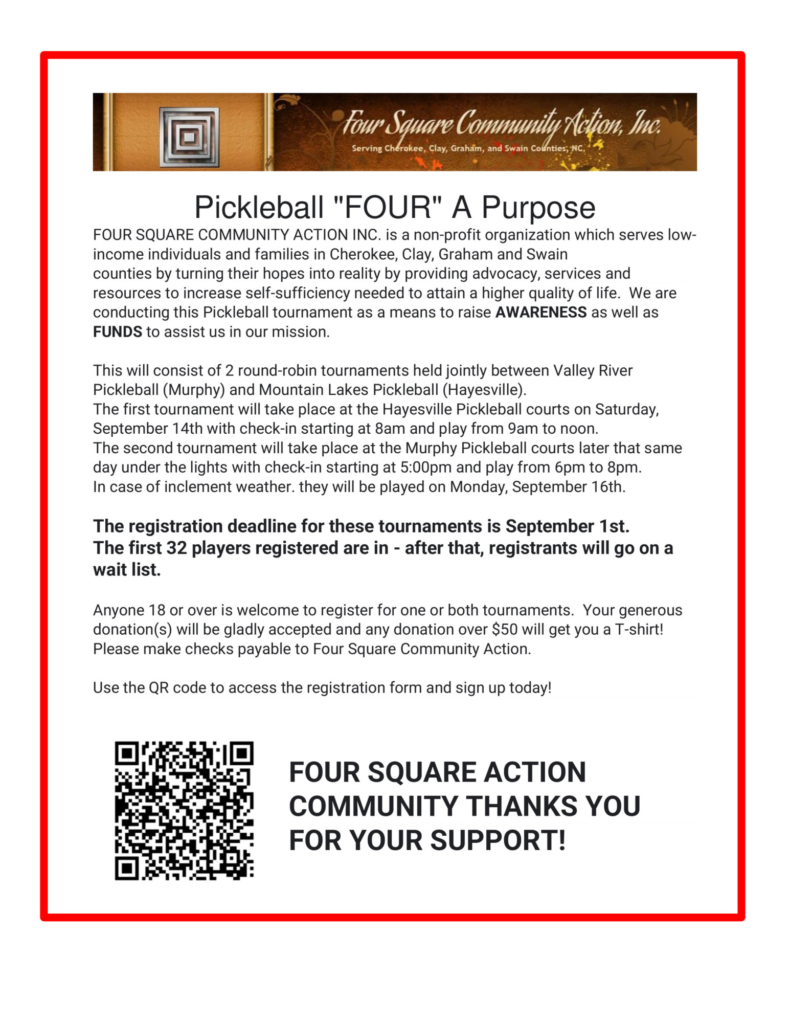Four Square Community Action will conduct a Pickleball Tournament to raise funds for services and awareness for low income individuals and families in our community.