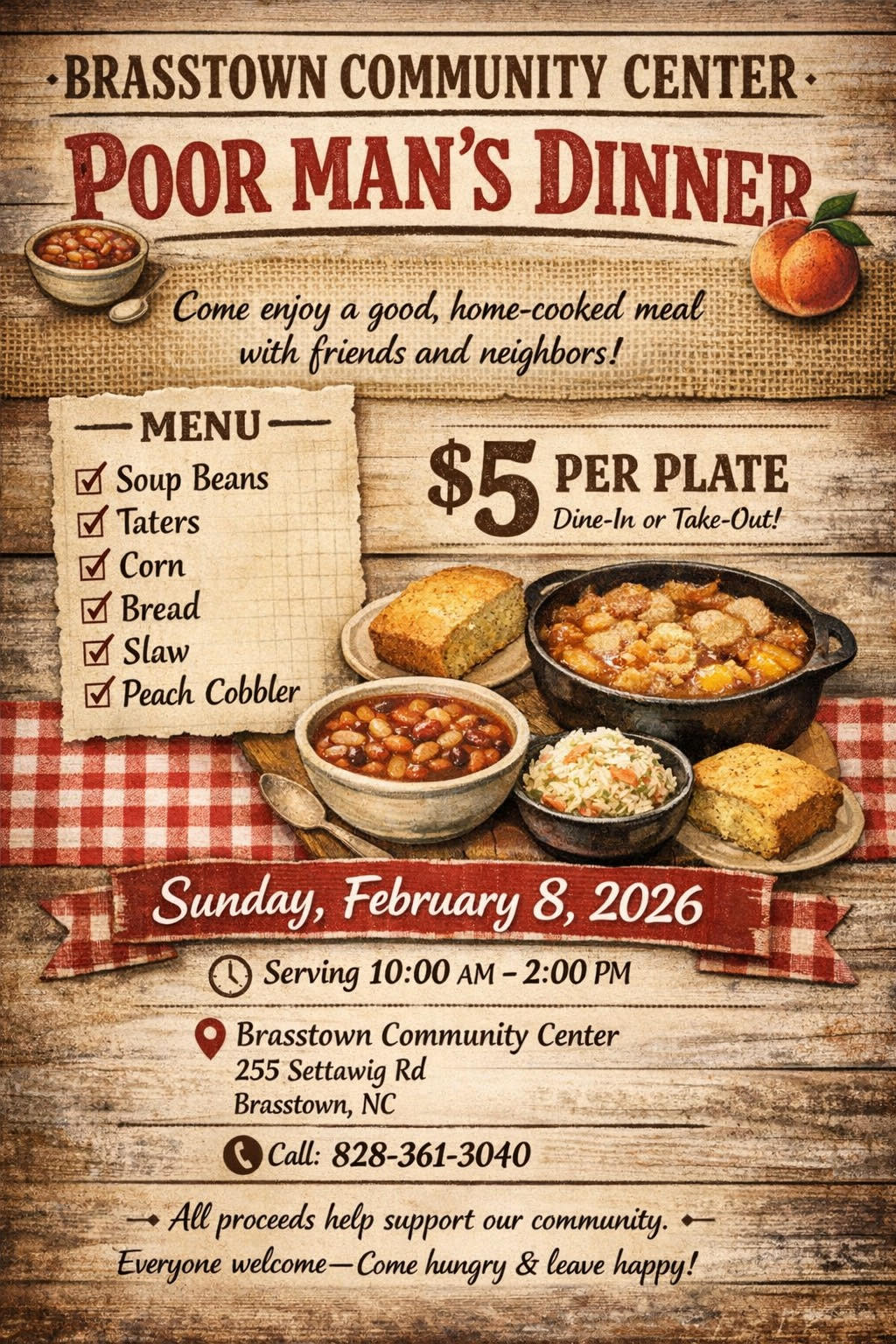 We are excited to inform you of our upcoming event. On Sunday, February 8th, the Brasstown Community Center will be hosting its “Poor Man's Dinner”! The dinner will run from 10:00 am until 2:00 pm. We will be serving boiled potatoes, pinto beans, cole slaw, corn muffins, and a variety of desserts and beverages. The cost will be $5.00 per person. You can either eat here with us or take a to-go plate. Come and join your neighbors and have some good ole food and friendship. Hope to see you all there. Everyone is welcome! If anyone is interested in helping out in any way, please let us know. All proceeds help support our community center. $5