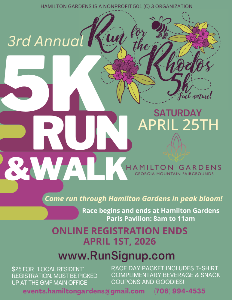 Run for the Rhodos is a unique, blossoming event presented by Hamilton Gardens of the entertainment rich Georgia Mountain Fairgrounds nestled in exceptionally scenic Hiawassee, Georgia. This runner/walker friendly 5K experience offers racers a woodland trail course that immerses you in our ravishing Rhododendron Garden while in its full bloom splendor! The proceeds from your participation in our 2026 Rhodo Fest garden run will support Hamilton Garden's! All participants registered before April 1, 2026, will receive a Rhodo race tee shirt! Price: $35.00 Race Fee + $3.10 Sign Up Fee.