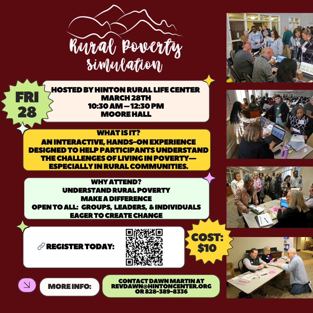 Hayesville, NC – Hinton Rural Life Center is inviting the local community to step into the shoes of those experiencing poverty through a transformative Rural Poverty Simulation on Friday, March 28, from 10:30 a.m. to 12:30 p.m. in Moore Hall. This interactive experience is designed to challenge participants to rethink the realities of poverty and consider how they can help create positive change in their own communities. $10 per person March 28th 10:30A-12:30P