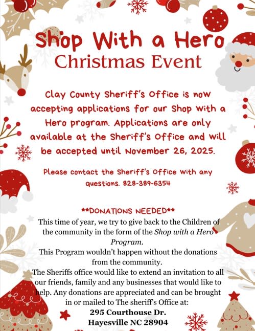 Clay County Sheriff's Office is accepting applications for its Shop With a Hero Program. Applications are only available at the Sheriff's Office and will be accepted until November 26, 2025. Please call the Sheriff's Office at 828-389-6354 with any questions. DONATIONS NEEDED! Donations can be mailed or brought to the Sheriff's Office at 295 Courthouse Drive in Hayesville.
