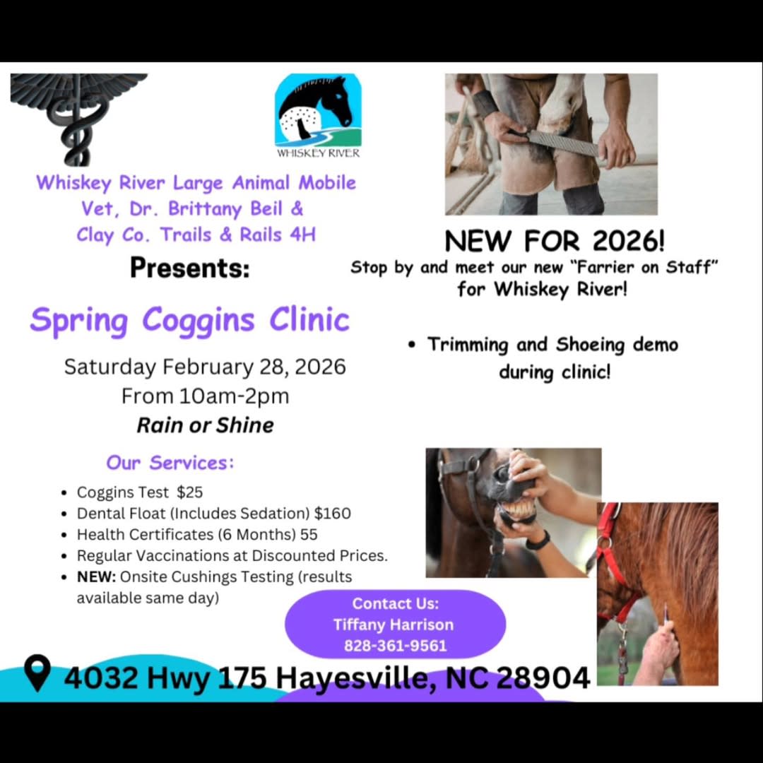It's almost time for the Trails & Rails 4-H Horse Club's Annual Coggins Clinic! Come out on Saturday, February 28th, from 10-2pm at 4032 Hwy 175, Hayesville, NC 28904. Rain or shine.