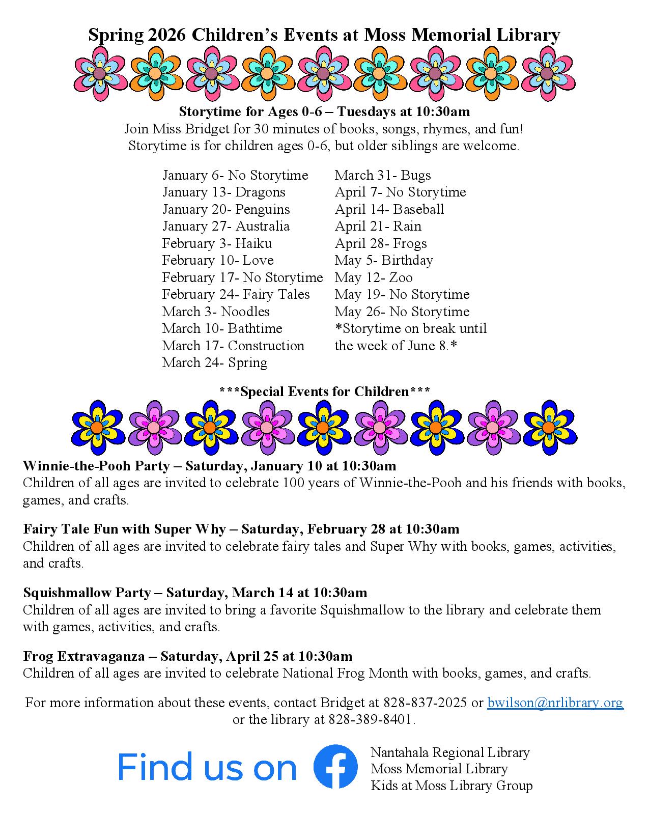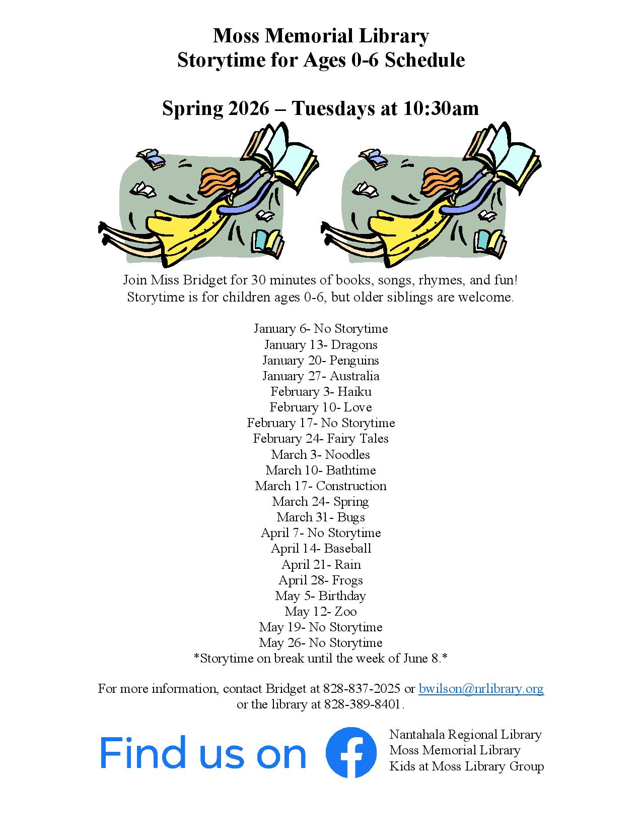 SPRING STORYTIME AT MOSS MEMORIAL LIBRARY
