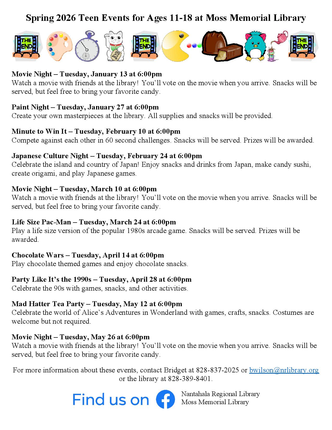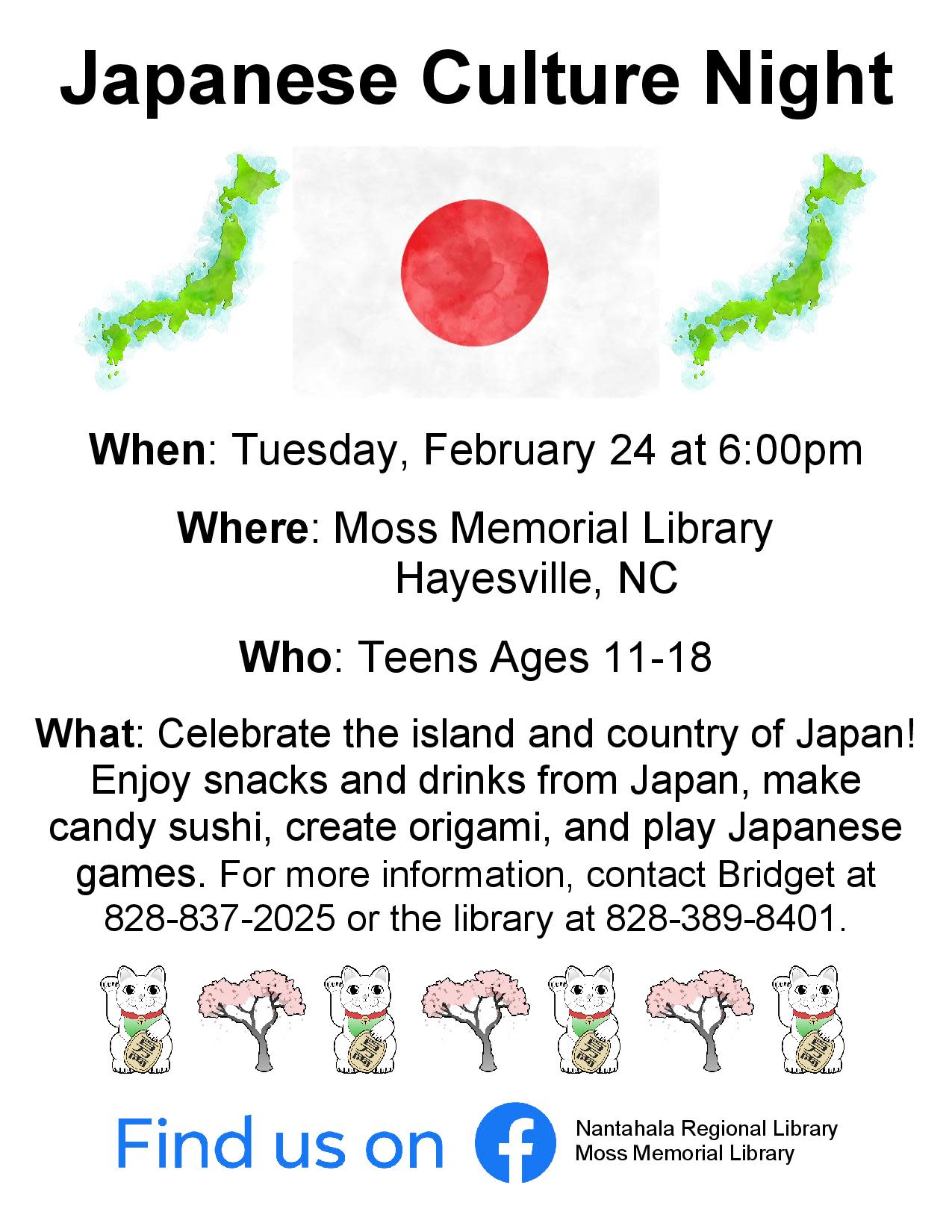 Teens ages 11-18 are invited to celebrate the island and country of Japan! Enjoy snacks and drinks from Japan, make candy sushi, create origami, and play Japanese games. For more information about this event, contact Bridget at 828-837-2025 or bwilson@nantahalalibrary.org or the library at 828-389-8401.