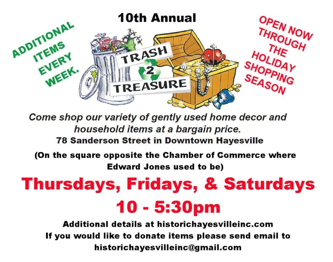 Each year the sale is coordinated by the Friends of Historic Hayesville committee and staffed with volunteers representing partner organizations to make this one of the best fund raisers for Small Town Main Street/HHI downtown projects. Trash to Treasure is a popular annual event and community support gets better each year. Gently used items, with very few restrictions, are collected and volunteers work to clean and sort all the items donated including housewares, furniture, linens, home décor, toys, guy stuff! etc. We cannot accept donations of clothes and electronics. We accept donations year round. Contact Sandy at (828) 361-7058 or Marie at (828) 371-1265 with any questions or to donate items. TRASH TO TREASURE IS NOW OPEN AND WILL CONTINUE THROUGH THE HOLIDAY SHOPPING SEASON AND BEYOND. THE LOCATION IS 78 SANDERSON STREET ON THE SQUARE WHERE EDWARD JONES USED TO BE. MANY ADDITIONAL ITEMS WILL BE ADDED WEEKLY SO SHOP OFTEN.