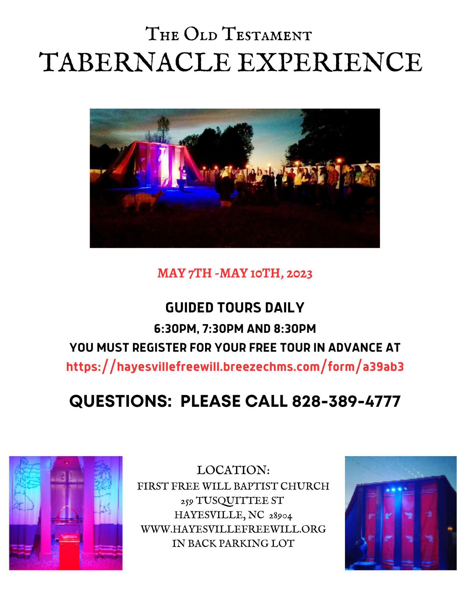 Come experience a real life drama of the exact replica of the Old Testament Tabernacle outside and inside. unforgettable.. YOU MUST SIGN UP ONLINE AT HTTPS://hayesvillefreewill.breezechms.com/form/a39ab3