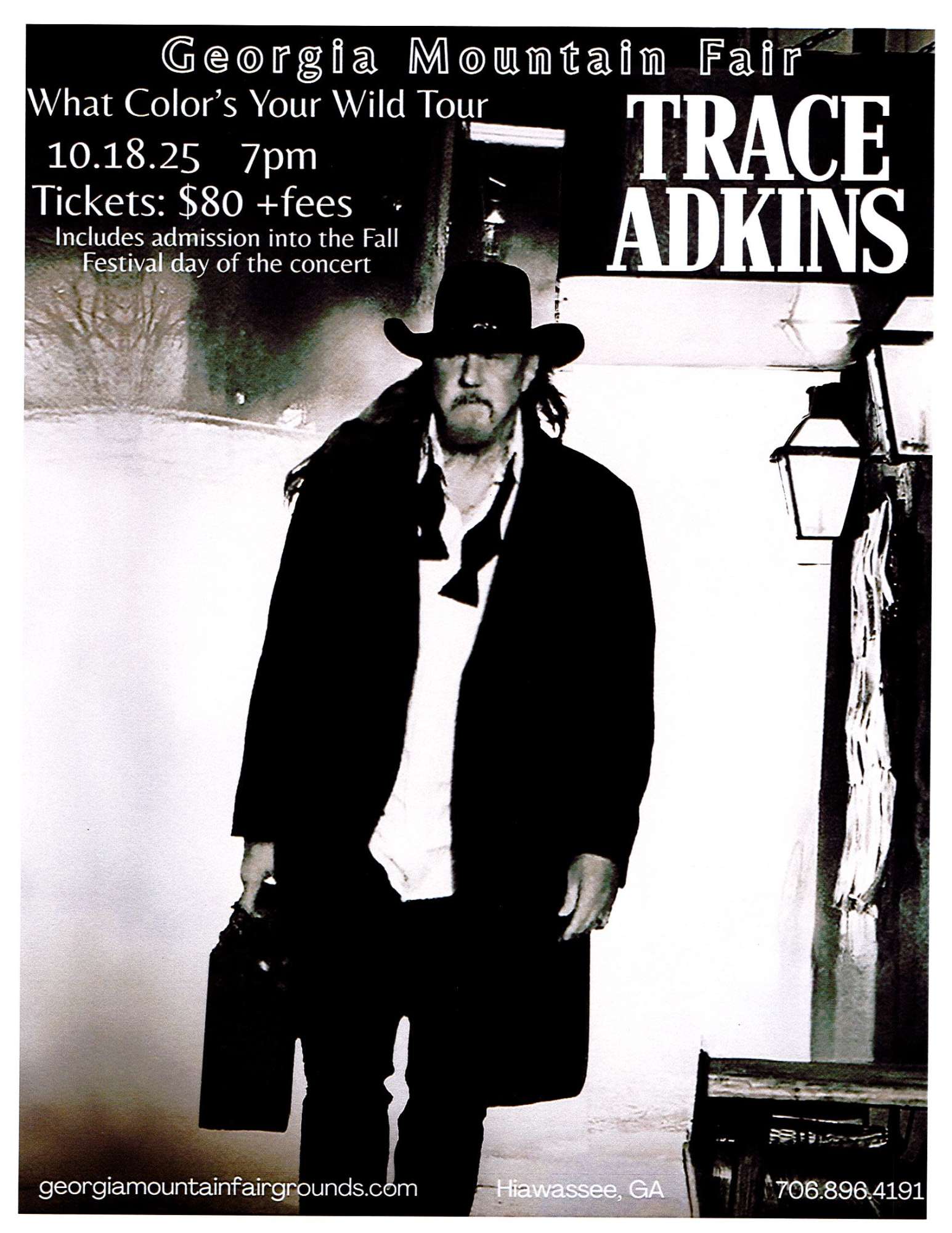 In his storied career in Country music, Trace Adkins has sold over 11 MILLION albums, charted 40 singles on Billboard's Country Airplay Chart, earned numerous awards, multiple GRAMMY nominations, and garnered over 2 BILLION streams. A Grand Ole Opry member for two decades, the Louisiana native is known for his dynamic baritone, fiery live performance, and notable roles as an actor in film and TV. Since his 1996 breakout debut DREAMIN' OUT LOUD delivered smashes “Every Light In The House,” which hit Top 5 on Billboard's Hot Country Songs chart and #1 “This Ain't (No Thinkin' Thing),” Adkins has pioneered a mix of classic Country minded traditionalism and adventurous, good-natured showmanship, breaking open new avenues in modern Country through fun-filled hits like “Honky Tonk Badonkadonk” and “Hillbilly Bone” with Blake Shelton. Celebrating the 25th anniversary of his debut with 2021's release THE WAY I WANNA GO (Verge Records), the 25-song album has been applauded by Billboard as “a creative tour de force that serves up the lyrical and stylistic diversity that would make his hero [Ronnie] Milsap proud,” with Rolling Stone calling it “lighthearted club-ready fun…,” and PEOPLE praising it as “packed to the hilt with hits.” From profound traditional balladry to clever-Country party anthems, the Mickey Jack Cones and Derek George produced project features special guests Blake Shelton, Luke Bryan, Melissa Etheridge, Pitbull, Snoop Dogg, Stevie Wonder on harmonica and more. Adkins is currently on tour playing headline shows spanning coast to coast throughout the year. ALL Seats: $80.00 + handling. Admission to Fall Festival included.