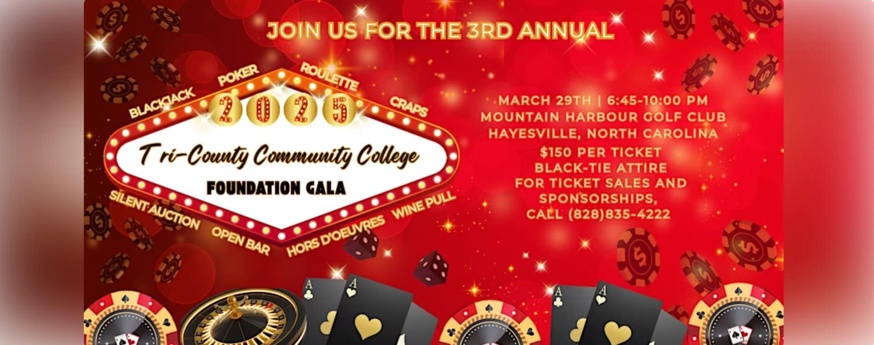 Join us for an unforgettable evening at the Third Annual Tri-County Community College Foundation Gala, featuring casino games, a silent auction, an open bar, a wine pull, and delicious food—all for a great cause. Your support will directly help the Foundation provide essential resources that empower students, strengthen programs, and foster community success. Together, we can advance the Foundation’s mission to support the comprehensive goals of the College and ensure every student has the tools they need to succeed. Don’t miss this exciting opportunity to make a lasting impact!