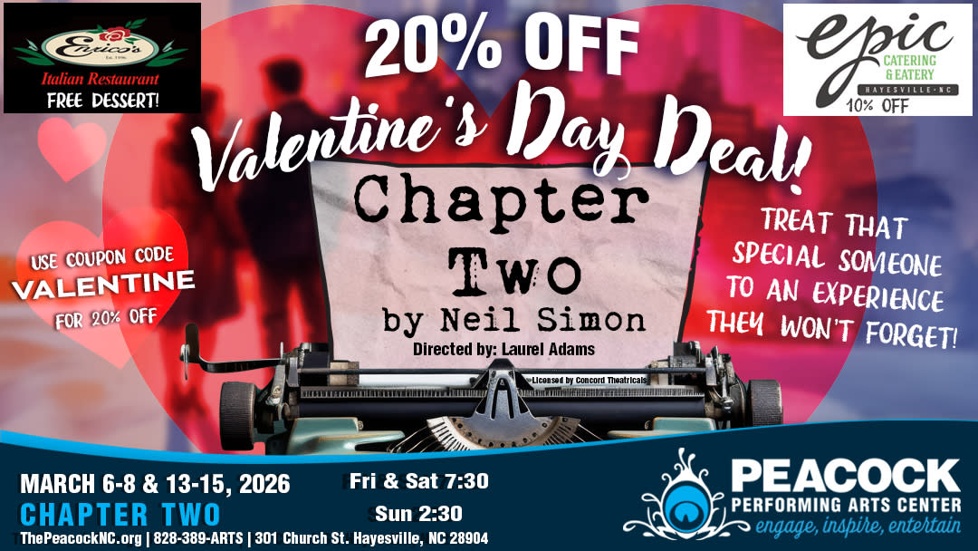 Looking for a way to sweep that special someone off their feet—or just want a fabulous night out with the girls? We’ve done the planning for you! Join us at the Peacock for Neil Simon’s Chapter Two, a romantic comedy full of wit, heart, and "second chances." To make your night even sweeter, we’re sharing the love with a special Valentine’s deal: ✨ SAVE 20% ON TICKETS! ✨ Use Coupon Code: VALENTINE (Valid now through February 15th, online only) MAKE IT A "DINNER & A SHOW" NIGHT: We’ve partnered with some of our favorite local spots to keep the celebration going: Enrico's Italian Restaurant (Young Harris): Enjoy a FREE dessert when you present your Chapter Two ticket or program! Epic Catering & Eatery (Hayesville): Take 10% OFF your meal when you show your Peacock ticket or program! Whether you’re bringing your Valentine, your best friend, or the whole crew, give them an experience they won't forget. High-energy comedy, local flavor, and great savings—all in one night. Claim your 20% discount and book your seats here: https://peacockperformingartscenter.thundertix.com/?coupon_codes%5B%5D=VALENTINE.