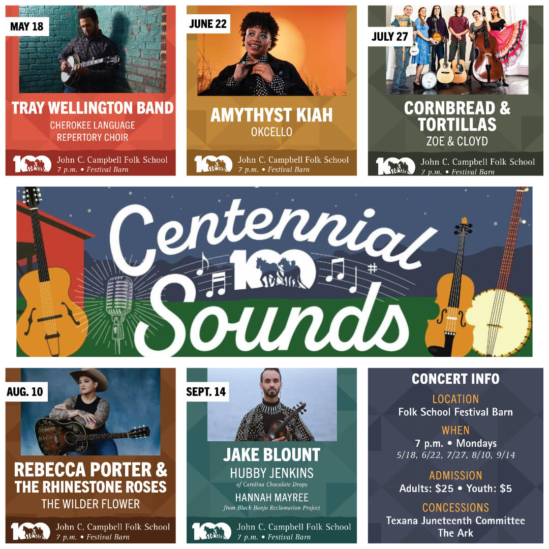 DESCRIPTION:Centennial Sounds Tickets Available Now! The Folk School is thrilled to announce Centennial Sounds\, a five-concert series celebrating 100 years of music\, community\, and the living traditions of Appalachia. As part of our yearlong centennial celebrations\, we are bringing some truly extraordinary artists to Brasstown on select Monday evenings from May through September 2026. All shows are held in the historic Festival Barn at 7 p.m.\, with doors opening at 6 p.m. $25 for adults and $5 for youth. Amplifying Diverse Appalachian Voices:This special series features performers who﻿se work expands and redefines the story of Appalachian music. Music and dance have been a vital part of the Folk School since its founding in 1925. As we celebrate our 100th year\, Centennial Sounds honors this legacy by spotlighting the cultural richness of Appalachian music and the many voices that shape it. This special performance series will feature five headliners whose work expands and redefines the story of Appalachian music. Through these concerts\, we aim to create new opportunities for our community in Western North Carolina to experience the full spectrum of Appalachian sound. Visit folkschool.org/sounds to learn more.May 18:  Tray Wellington Band blends Appalachian roots with jazz\, funk\, and global influences. Joining them\, the Cherokee Language Repertory Choir preserves Cherokee language through shaped-note singing\, reimagining the Christian Harmony tradition and sustaining cultural heritage in Western North Carolina.