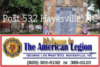 Monthly meetings are on the last Tuesday of every month at Clay County Community Building (25 Riverside Circle, Hayesville) at 1800 hrs. with Ladies Auxiliary. Post meeting to follow at 1900 hrs. The American Legion was chartered by Congress in 1919 as a patriotic, war-time veteran’s organization, and devoted to mutual helpfulness. Non-profit membership